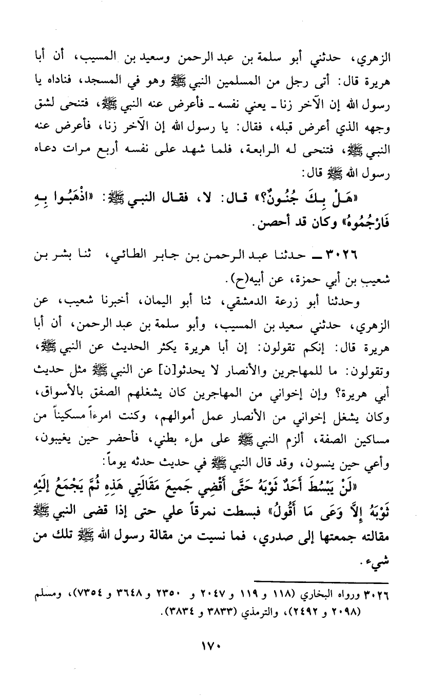3026 - حَدَّثَنَا عَبْدُ الرَّحْمَنِ بْنُ جَابِرٍ الطَّائِيُّ، ثَنَا بِشْرُ بْنُ شُعَيْبِ بْنِ أَبِي حَمْزَةَ، عَنْ أَبِيهِ، ح وَحَدَّثَنَا أَبُو زُرْعَةَ الدِّمَشْقِيُّ، ثَنَا أَبُو الْيَمَانِ، أَخْبَرَنَا شُعَيْبٌ، عَنِ الزُّهْرِيِّ، حَدَّثَنِي سَعِيدُ بْنُ الْمُسَيِّبِ، وَأَبُو سَلَمَةَ بْنُ عَبْدِ الرَّحْمَنِ، أَنَّ أَبَا هُرَيْرَةَ، قَالَ: إِنَّكُمْ تَقُولُونَ: إِنَّ أَبَا هُرَيْرَةَ يُكْثِرُ الْحَدِيثَ عَنِ النَّبِيِّ صَلَّى اللهُ عَلَيْهِ وَسَلَّمَ، وَتَقُولُونَ: مَا لِلْمُهَاجِرِينَ وَالْأَنْصَارِ لَا يُحَدِّثُو [نَ] عَنِ النَّبِيِّ صَلَّى اللهُ عَلَيْهِ وَسَلَّمَ مِثْلَ حَدِيثِ أَبِي هُرَيْرَةَ؟ وَإِنَّ إِخْوَانِي مِنَ الْمُهَاجِرِينَ كَانَ يَشْغَلُهُمُ الصَّفْقُ بِالْأَسْوَاقِ، وَكَانَ يَشْغَلُ إِخْوَانِي مِنَ الْأَنْصَارِ عَمَلُ أَمْوَالِهِمْ، وَكُنْتُ امْرَءًا مِسْكِينًا مِنْ مَسَاكِينِ الصُّفَّةِ، أَلْزَمُ النَّبِيَّ صَلَّى اللهُ عَلَيْهِ وَسَلَّمَ عَلَى مِلْءِ بَطْنِي، فَأَحْضُرُ حِينَ يَغِيبُونَ، وَأَعِي حِينَ يَنْسَوْنَ، وَقَدْ قَالَ النَّبِيُّ صَلَّى اللهُ عَلَيْهِ وَسَلَّمَ فِي حَدِيثٍ حَدَّثَهُ يَوْمًا: «§لَنْ يَبْسُطَ أَحَدٌ ثَوْبَهُ حَتَّى أَقْضِيَ جَمِيعَ مَقَالَتِي هَذِهِ، ثُمَّ يَجْمَعُ إِلَيْهِ ثَوْبَهُ إِلَّا وَعَى مَا أَقُولُ» فَبَسَطْتُ نُمْرُقًا عَلَيَّ حَتَّى إِذَا قَضَى النَّبِيُّ صَلَّى اللهُ عَلَيْهِ وَسَلَّمَ مَقَالَتَهُ جَمَعْتُهَا إِلَى صَدْرِي، فَمَا نَسِيتُ مِنْ مَقَالَةِ رَسُولِ اللَّهِ صَلَّى اللهُ عَلَيْهِ وَسَلَّمَ تِلْكَ مِنْ شَيْءٍ
