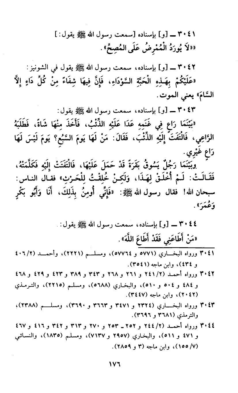 3041 - وَبِإِسْنَادِهِ [سَمِعْتُ رَسُولَ اللَّهِ صَلَّى اللهُ عَلَيْهِ وَسَلَّمَ] يَقُولُ: §«لَا يُورَدُ الْمُمْرِضُ عَلَى الْمُصِحِّ»