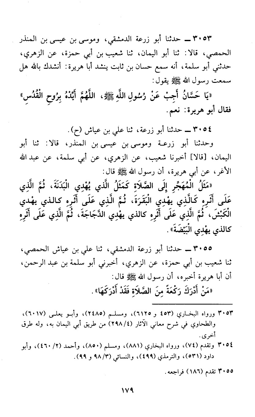 3054 - حَدَّثَنَا أَبُو زُرْعَةَ، ثَنَا عَلِيُّ بْنُ عَيَّاشٍ، ح وَحَدَّثَنَا أَبُو زُرْعَةَ، وَمُوسَى بْنُ عِيسَى بْنِ الْمُنْذِرِ، قَالَا: ثَنَا أَبُو الْيَمَانِ، قَالَا أَخْبَرَنَا شُعَيْبٌ، عَنِ الزُّهْرِيِّ، عَنْ أَبِي سَلَمَةَ، عَنْ عَبْدِ اللَّهِ الْأَغَرِّ، عَنْ أَبِي هُرَيْرَةَ، أَنَّ رَسُولَ اللَّهِ صَلَّى اللهُ عَلَيْهِ وَسَلَّمَ قَالَ: §«مَثَلُ الْمُهَجِّرِ إِلَى الصَّلَاةِ كَمَثَلِ الَّذِي يَهْدِي الْبَدَنَةَ، ثُمَّ الَّذِي عَلَى أَثَرِهِ كَالَّذِي يَهْدِي الْبَقَرَةَ، ثُمَّ الَّذِي عَلَى أَثَرِهِ كَالَّذِي يَهْدِي الْكَبْشَ، ثُمَّ الَّذِي عَلَى أَثَرِهِ كَالَّذِي يَهْدِي الدَّجَاجَةَ، ثُمَّ الَّذِي عَلَى أَثَرِهِ كَالَّذِي يَهْدِي الْبَيْضَةَ»