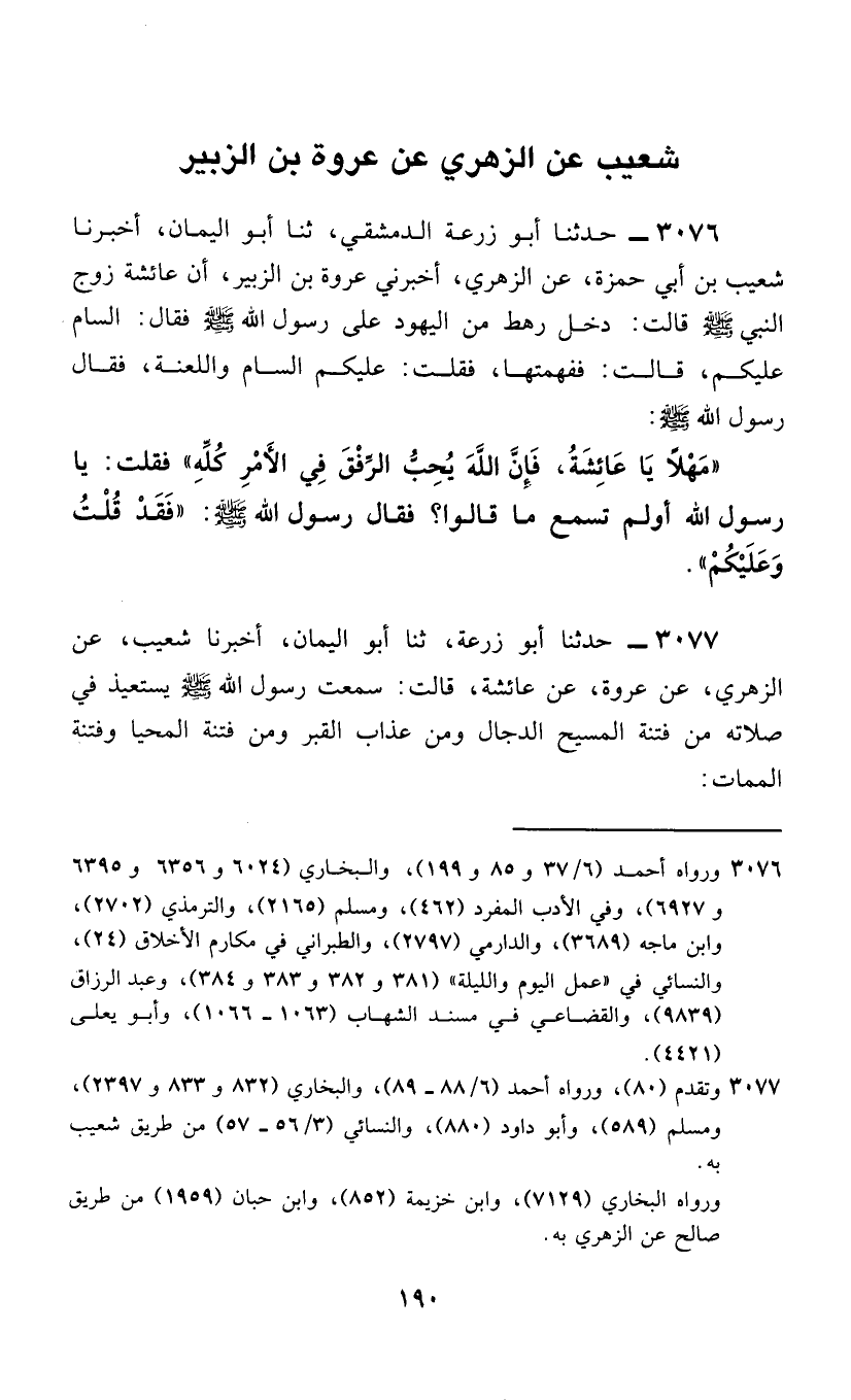 3076 - حَدَّثَنَا أَبُو زُرْعَةَ الدِّمَشْقِيُّ، ثَنَا أَبُو الْيَمَانِ، أَخْبَرَنَا شُعَيْبُ بْنُ أَبِي حَمْزَةَ، عَنِ الزُّهْرِيِّ، أَخْبَرَنِي عُرْوَةُ بْنُ الزُّبَيْرِ، أَنَّ عَائِشَةَ، زَوْجَ النَّبِيِّ صَلَّى اللهُ عَلَيْهِ وَسَلَّمَ قَالَتْ: دَخَلَ رَهْطٌ مِنَ الْيَهُودِ عَلَى رَسُولِ اللَّهِ صَلَّى اللهُ عَلَيْهِ وَسَلَّمَ فَقَالَ: السَّامُ عَلَيْكُمْ، قَالَتْ: فَفَهِمْتُهَا، فَقُلْتُ: عَلَيْكُمُ السَّامُ وَاللَّعْنَةُ، فَقَالَ رَسُولُ اللَّهِ صَلَّى اللهُ عَلَيْهِ وَسَلَّمَ: «§مَهْلًا يَا عَائِشَةُ، فَإِنَّ اللَّهَ يُحِبُّ الرِّفْقَ فِي الْأَمْرِ كُلِّهِ» فَقُلْتُ: يَا رَسُولَ اللَّهِ أَوَلَمْ تَسْمَعْ مَا قَالُوا؟ فَقَالَ رَسُولُ اللَّهِ صَلَّى اللهُ عَلَيْهِ وَسَلَّمَ: " فَقَدْ قُلْتِ: وَعَلَيْكُمْ "