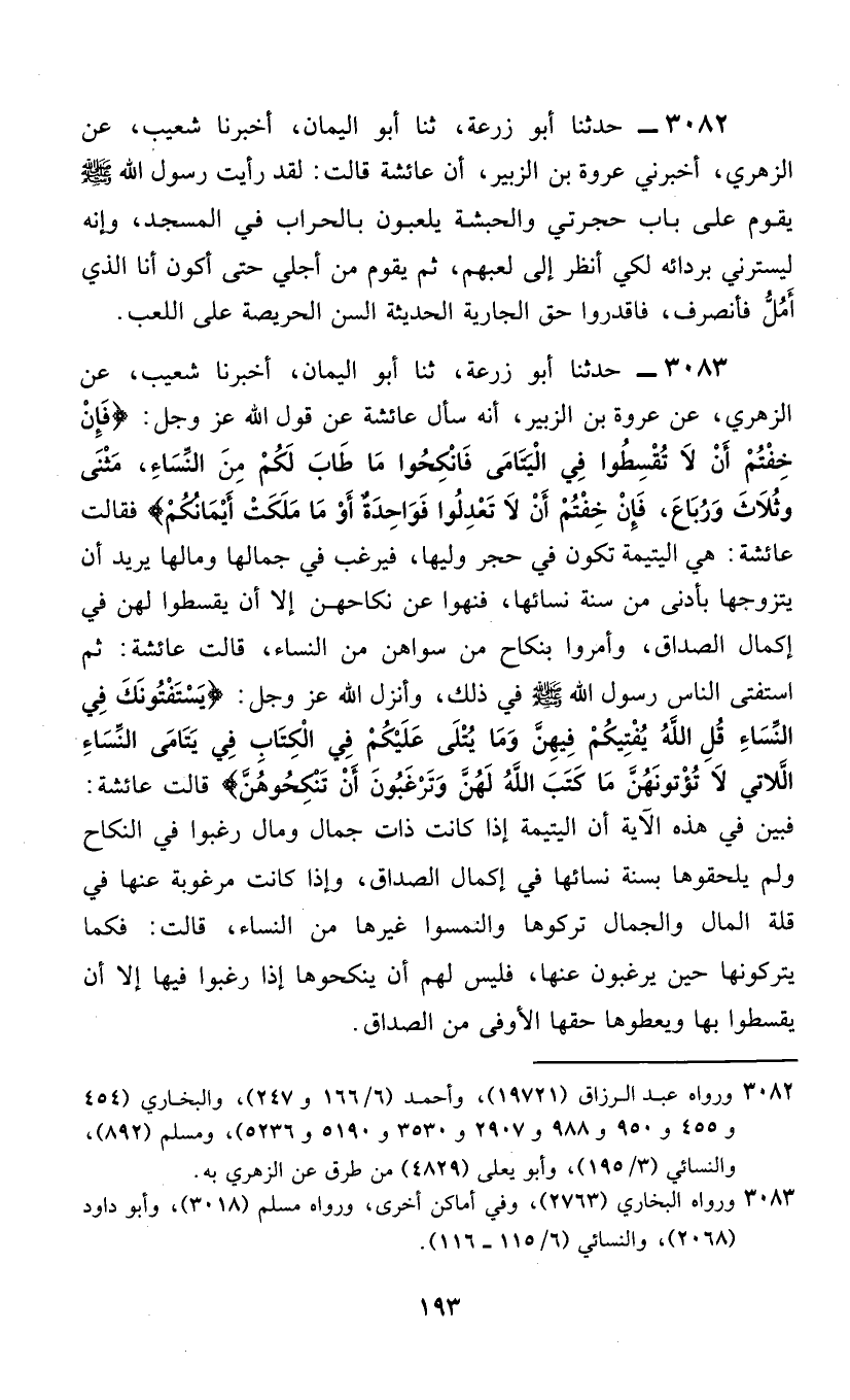3083 - حَدَّثَنَا أَبُو زُرْعَةَ، ثَنَا أَبُو الْيَمَانِ، أَخْبَرَنَا شُعَيْبٌ، عَنِ الزُّهْرِيِّ، عَنْ عُرْوَةَ بْنِ الزُّبَيْرِ، أَنَّهُ سَأَلَ عَائِشَةَ عَنْ قَوْلِ اللَّهِ، عَزَّ وَجَلَّ: §وَإِنْ خِفْتُمْ أَلَّا تُقْسِطُوا فِي الْيَتَامَى فَانْكِحُوا مَا طَابَ لَكُمْ مِنَ النِّسَاءِ، مَثْنَى وَثُلَاثَ وَرُبَاعَ، فَإِنْ خِفْتُمْ أَلَّا تَعْدِلُوا فَوَاحِدَةً أَوْ مَا مَلَكَتْ أَيْمَانُكُمْ فَقَالَتْ عَائِشَةُ: " هِيَ الْيَتِيمَةُ تَكُونُ فِي حِجْرِ وَلِيِّهَا، فَيَرْغَبُ فِي جَمَالِهَا وَمَالِهَا يُرِيدُ أَنْ يَتَزَوَّجَهَا بِأَدْنَى مِنْ سُنَّةِ نِسَائِهَا، فَنُهُوا عَنْ نِكَاحِهِنَّ إِلَّا أَنْ يُقْسِطُوا لَهُنَّ فِي إِكْمَالِ الصَّدَاقِ، وَأُمِرُوا بِنِكَاحِ مَنْ سِوَاهُنَّ مِنَ النِّسَاءِ، قَالَتْ عَائِشَةُ: ثُمَّ اسْتَفْتَى النَّاسُ رَسُولَ اللَّهِ صَلَّى اللهُ عَلَيْهِ وَسَلَّمَ فِي ذَلِكَ، وَأَنْزَلَ اللَّهُ عَزَّ وَجَلَّ: يَسْتَفْتُونَكَ فِي النِّسَاءِ قُلِ اللَّهُ يُفْتِيكُمْ فِيهِنَّ وَمَا يُتْلَى عَلَيْكُمْ فِي الْكِتَابِ فِي يَتَامَى النِّسَاءِ اللَّاتِي لَا تُؤْتُونَهُنَّ مَا كَتَبَ اللَّهُ لَهُنَّ وَتَرْغَبُونَ أَنْ تَنْكِحُوهُنَّ " قَالَتْ عَائِشَةُ: " فَبَيَّنَ فِي هَذِهِ الْآيَةِ أَنَّ الْيَتِيمَةَ إِذَا كَانَتْ ذَاتَ جَمَالٍ وَمَالٍ رَغِبُوا فِي النِّكَاحِ وَلَمْ يُلْحِقُوهَا بِسُنَّةِ نِسَائِهَا فِي إِكْمَالِ الصَّدَاقِ، وَإِذَا كَانَتْ مَرْغُوبَةً عَنْهَا فِي قِلَّةِ الْمَالِ وَالْجَمَالِ تَرَكُوهَا وَالْتَمَسُوا غَيْرَهَا مِنَ النِّسَاءِ، قَالَتْ: فَكَمَا يَتْرُكُونَهَا حِينَ يَرْغَبُونَ عَنْهَا، فَلَيْسَ لَهُمْ أَنْ يَنْكِحُوهَا إِذَا رَغِبُوا فِيهَا إِلَّا أَنْ يُقْسِطُوا بِهَا وَيُعْطُوهَا حَقَّهَا الْأَوْفَى مِنَ الصَّدَاقِ "