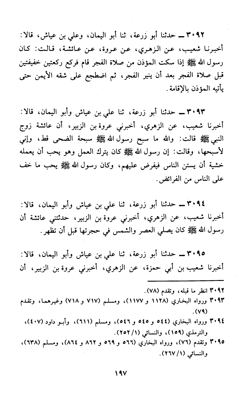 3093 - حَدَّثَنَا أَبُو زُرْعَةَ، ثَنَا عَلِيُّ بْنُ عَيَّاشٍ، وَأَبُو الْيَمَانِ، قَالَا: أَخْبَرَنَا شُعَيْبٌ، عَنِ الزُّهْرِيِّ، أَخْبَرَنِي عُرْوَةُ بْنُ الزُّبَيْرِ، أَنَّ عَائِشَةَ، زَوْجَ النَّبِيِّ صَلَّى اللهُ عَلَيْهِ وَسَلَّمَ قَالَتْ: «وَاللَّهِ §مَا سَبَّحَ رَسُولُ اللَّهِ صَلَّى اللهُ عَلَيْهِ وَسَلَّمَ سُبْحَةَ الضُّحَى قَطُّ، وَإِنِّي لَأُسَبِّحُهَا» ، وَقَالَتْ: «إِنَّ رَسُولَ اللَّهِ صَلَّى اللهُ عَلَيْهِ وَسَلَّمَ كَانَ يَتْرُكُ الْعَمَلَ وَهُوَ يُحِبُّ أَنْ يَعْمَلَهُ خَشْيَةَ أَنْ يَسْتَنَّ النَّاسُ فَيُفْرَضَ عَلَيْهِمْ، وَكَانَ رَسُولُ اللَّهِ صَلَّى اللهُ عَلَيْهِ وَسَلَّمَ يُحِبُّ مَا خَفَّ عَلَى النَّاسِ مِنَ الْفَرَائِضِ»