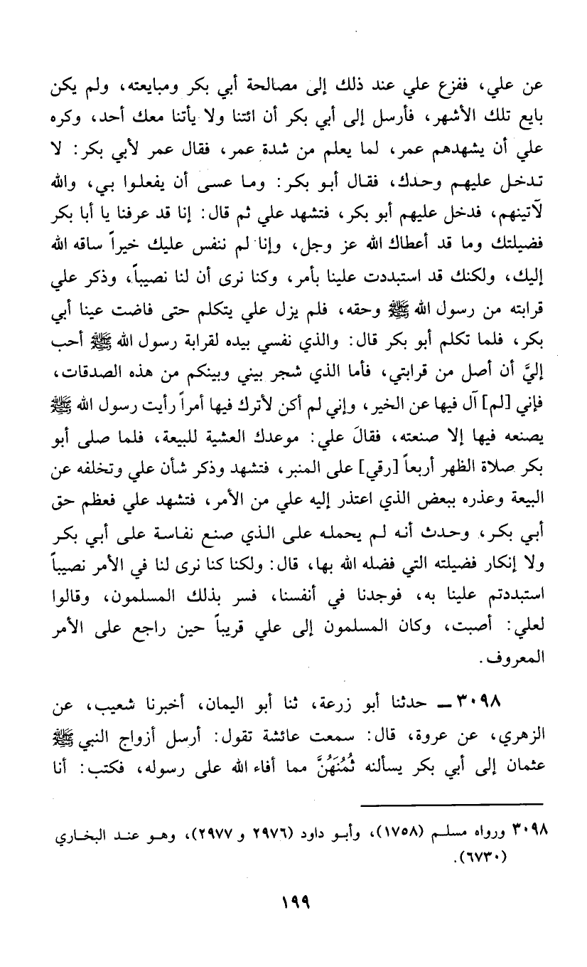 3098 - حَدَّثَنَا أَبُو زُرْعَةَ، ثَنَا أَبُو الْيَمَانِ، أَخْبَرَنَا شُعَيْبٌ، عَنِ الزُّهْرِيِّ، عَنْ عُرْوَةَ، قَالَ: سَمِعْتُ عَائِشَةَ، تَقُولُ: أَرْسَلَ أَزْوَاجُ النَّبِيِّ صَلَّى اللهُ عَلَيْهِ وَسَلَّمَ عُثْمَانَ إِلَى أَبِي بَكْرٍ يَسْأَلْنَهُ ثُمُنَهُنَّ مِمَّا أَفَاءَ اللَّهُ عَلَى رَسُولِهِ، فَكَتَبَ: أَنَا -[200]- أَرُدُّهُنَّ عَنْ ذَلِكَ، فَقُلْتُ لَهُنَّ: أَلَا تَتَّقِينَ اللَّهَ؟ أَلَمْ تَعْلَمْنَ أَنَّ رَسُولَ اللَّهِ صَلَّى اللهُ عَلَيْهِ وَسَلَّمَ كَانَ يَقُولُ: §«لَا نُورَثُ - يُرِيدُ بِذَلِكَ نَفْسَهُ - مَا تَرَكْنَا صَدَقَةٌ، إِنَّمَا يَأْكُلُ آلُ مُحَمَّدٍ مِنْ هَذَا الْمَالِ» فَانْتَهَى أَزْوَاجُ النَّبِيِّ صَلَّى اللهُ عَلَيْهِ وَسَلَّمَ إِلَى مَا أَخْبَرَتُهُنَّ