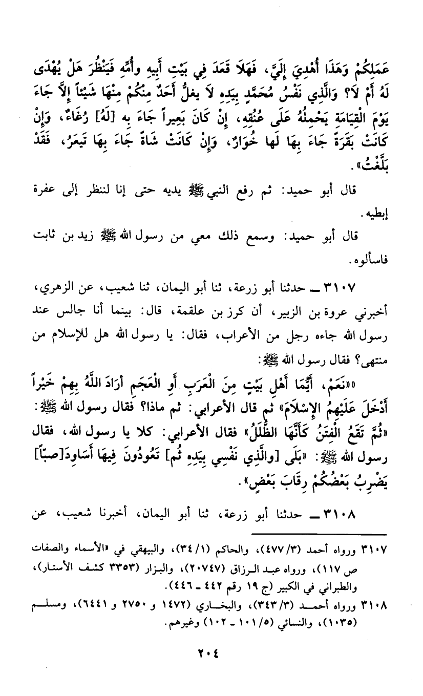 3107 - حَدَّثَنَا أَبُو زُرْعَةَ، ثَنَا أَبُو الْيَمَانِ، ثَنَا شُعَيْبٌ، عَنِ الزُّهْرِيِّ، أَخْبَرَنِي عُرْوَةُ بْنُ الزُّبَيْرِ، أَنَّ كُرْزَ بْنَ عَلْقَمَةَ، قَالَ: بَيْنَمَا أَنَا جَالِسٌ، عِنْدَ رَسُولِ اللَّهِ جَاءَهُ رَجُلٌ مِنَ الْأَعْرَابِ، فَقَالَ: يَا رَسُولَ اللَّهِ هَلْ لِلْإِسْلَامِ مِنْ مُنْتَهًى؟ فَقَالَ رَسُولُ اللَّهِ صَلَّى اللهُ عَلَيْهِ وَسَلَّمَ: «نَعَمْ، §أَيُّمَا أَهْلُ بَيْتٍ مِنَ الْعَرَبِ أَوِ الْعَجَمِ أَرَادَ اللَّهُ بِهِمْ خَيْرًا أَدْخَلَ عَلَيْهِمُ الْإِسْلَامَ» ثُمَّ قَالَ الْأَعْرَابِيُّ: ثُمَّ مَاذَا؟ فَقَالَ رَسُولُ اللَّهِ صَلَّى اللهُ عَلَيْهِ وَسَلَّمَ «ثُمَّ تَقَعُ الْفِتَنُ كَأَنَّهَا الظُّلَلُ» فَقَالَ الْأَعْرَابِيُّ: كَلَّا يَا رَسُولَ اللَّهِ، فَقَالَ رَسُولُ اللَّهِ صَلَّى اللهُ عَلَيْهِ وَسَلَّمَ: «بَلَى [وَالَّذِي نَفْسِي بِيَدِهِ، ثُمَّ] تَعُودُونَ فِيهَا أَسَاوِدَ [صَبًّا] يَضْرِبُ بَعْضُكُمْ رِقَابَ بَعْضٍ»