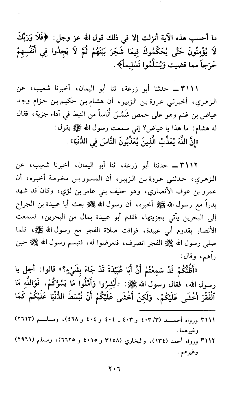 3112 - حَدَّثَنَا أَبُو زُرْعَةَ، ثَنَا أَبُو الْيَمَانِ، أَخْبَرَنَا شُعَيْبٌ، عَنِ الزُّهْرِيِّ، حَدَّثَنِي عُرْوَةُ بْنُ الزُّبَيْرِ، أَنَّ الْمِسْوَرَ بْنَ مَخْرَمَةَ، أَخْبَرَهُ، أَنَّ عَمْرَو بْنَ عَوْفٍ الْأَنْصَارِيَّ، وَهُوَ حَلِيفُ بَنِي عَامِرِ بْنِ لُؤَيٍّ، وَكَانَ قَدْ شَهِدَ بَدْرًا مَعَ رَسُولِ اللَّهِ صَلَّى اللهُ عَلَيْهِ وَسَلَّمَ أَخْبَرَهُ، أَنَّ رَسُولَ اللَّهِ صَلَّى اللهُ عَلَيْهِ وَسَلَّمَ بَعَثَ أَبَا عُبَيْدَةَ بْنَ الْجَرَّاحِ إِلَى الْبَحْرَيْنِ يَأْتِي بِجِزْيَتِهَا، فَقَدِمَ أَبُو عُبَيْدَةَ بِمَالٍ مِنَ الْبَحْرَيْنِ، فَسَمِعْتِ الْأَنْصَارَ بِقُدُومِ أَبِي عُبَيْدَةَ، فَوَافَتْ صَلَاةُ الْفَجْرِ مَعَ رَسُولِ اللَّهِ صَلَّى اللهُ عَلَيْهِ وَسَلَّمَ، فَلَمَّا صَلَّى رَسُولُ اللَّهِ صَلَّى اللهُ عَلَيْهِ وَسَلَّمَ الْفَجْرَ انْصَرَفَ، فَتَعَرَّضُوا لَهُ، فَتَبَسَّمَ رَسُولُ اللَّهِ صَلَّى اللهُ عَلَيْهِ وَسَلَّمَ حِينَ رَآهُمْ، وَقَالَ: «أَظُنُّكُمْ قَدْ سَمِعْتُمْ أَنَّ أَبَا عُبَيْدَةَ قَدْ جَاءَ بِشَيْءٍ؟» قَالُوا: أَجَلْ يَا رَسُولَ اللَّهِ، فَقَالَ رَسُولُ اللَّهِ صَلَّى اللهُ عَلَيْهِ وَسَلَّمَ: أَبْشِرُوا وَأَمِّلُوا مَا يَسُرُّكُمْ، فَوَاللَّهِ، §مَا الْفَقْرُ أَخْشَى عَلَيْكُمْ، وَلَكِنْ أَخْشَى عَلَيْكُمْ أَنْ تُبْسَطَ الدُّنْيَا عَلَيْكُمْ كَمَا -[207]- بُسِطَتْ عَلَى مَنْ قَبْلَكُمْ فَتَنَافَسُوهَا كَمَا تَنَافَسُوهَا وَتُهْلِكَكُمْ كَمَا أَهْلَكَتْهُمْ "