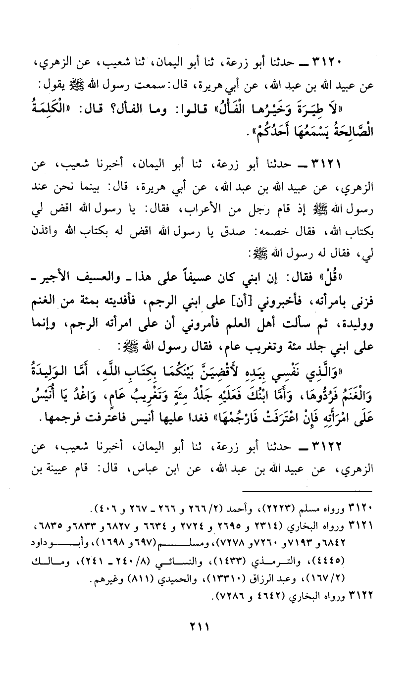 3121 - حَدَّثَنَا أَبُو زُرْعَةَ، ثَنَا أَبُو الْيَمَانِ، أَخْبَرَنَا شُعَيْبٌ، عَنِ الزُّهْرِيِّ، عَنْ عُبَيْدِ اللَّهِ بْنِ عَبْدِ اللَّهِ، عَنْ أَبِي هُرَيْرَةَ، قَالَ: بَيْنَمَا نَحْنُ عِنْدَ رَسُولِ اللَّهِ صَلَّى اللهُ عَلَيْهِ وَسَلَّمَ إِذْ قَامَ رَجُلٌ مِنَ الْأَعْرَابِ، فَقَالَ: يَا رَسُولَ اللَّهِ اقْضِ لِي بِكِتَابِ اللَّهِ، فَقَالَ خَصْمُهُ: صَدَقَ يَا رَسُولَ اللَّهِ اقْضِ لَهُ بِكِتَابِ اللَّهِ وَائْذَنْ لِي، فَقَالَ لَهُ رَسُولُ اللَّهِ صَلَّى اللهُ عَلَيْهِ وَسَلَّمَ: «قُلْ» فَقَالَ: إِنَّ ابْنِي كَانَ عَسِيفًا عَلَى هَذَا - وَالْعَسِيفُ الْأَجِيرُ - فَزَنَى بِامْرَأَتِهِ، فَأَخْبَرُونِي أَنَّ عَلَىَ ابْنِيَ الرَّجْمَ، فَأَفْدَيْتُهُ بِمِائَةٍ مِنَ الْغَنَمِ وَوَلِيدَةٍ، ثُمَّ سَأَلْتُ أَهْلَ الْعِلْمِ فَأَمَرُونِي أَنَّ عَلَى امْرَأَتِهِ الرَّجْمَ، وَإِنَّمَا عَلَى ابْنِي جَلْدُ مِائَةٍ وَتَغْرِيبُ عَامٍ، فَقَالَ رَسُولُ اللَّهِ صَلَّى اللهُ عَلَيْهِ وَسَلَّمَ: «وَالَّذِي نَفْسِي بِيَدِهِ لَأَقْضِيَنَّ بَيْنَكُمَا بِكِتَابِ اللَّهِ، §أَمَا الْوَلِيدَةُ وَالْغَنَمُ فَرُدُّوهَا، وَأَمَّا ابْنُكَ فَعَلَيْهِ جَلْدُ مِائَةٍ وَتَغْرِيبُ عَامٍ، وَاغْدُ يَا أُنَيْسُ عَلَى امْرَأَتِهِ فَإِنِ اعْتَرَفَتْ فَارْجُمْهَا» فَغَدَا عَلَيْهَا أُنَيْسُ فَاعْتَرَفَتْ فَرَجَمَهَا