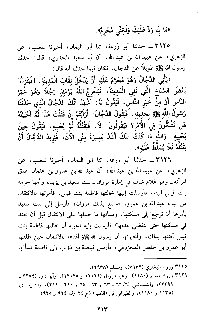 3125 - حَدَّثَنَا أَبُو زُرْعَةَ، ثَنَا أَبُو الْيَمَانِ، أَخْبَرَنَا شُعَيْبٌ، عَنِ الزُّهْرِيِّ، عَنْ عُبَيْدِ اللَّهِ بْنِ عَبْدِ اللَّهِ، أَنَّ أَبَا سَعِيدٍ الْخُدْرِيَّ، قَالَ: حَدَّثَنَا رَسُولُ اللَّهِ صَلَّى اللهُ عَلَيْهِ وَسَلَّمَ طَوِيلًا عَنِ الدَّجَّالِ، فَكَانَ فِيمَا حَدَّثَنَا أَنَّهُ قَالَ: " §يَأْتِي الدَّجَّالُ وَهُوَ مُحَرَّمٌ عَلَيْهِ أَنْ يَدْخُلَ نِقَابَ الْمَدِينَةِ، [فَيَنْزِلُ] بَعْضَ السِّبَاخِ الَّتِي تَلِي الْمَدِينَةَ، فَيُخْرُجُ اللَّهُ يَوْمَئِذٍ رَجُلًا وَهُوَ خَيْرُ النَّاسِ أَوْ مِنْ خَيْرِ النَّاسِ، فَيَقُولُ لَهُ: أَشْهَدُ أَنَّكَ الدَّجَّالَ الَّذِي حَدَّثَنَا رَسُولُ اللَّهِ صَلَّى اللهُ عَلَيْهِ وَسَلَّمَ بِحَدِيثِهِ، فَيَقُولُ الدَّجَّالُ: أَرَأَيْتُمْ إِنْ قَتَلْتُ هَذَا، ثُمَّ أَحْيَيْتُهُ هَلْ تَشُكُّونَ فِي الْأَمْرِ؟ فَيَقُولُونَ: لَا، فَيَقْتُلُهُ ثُمَّ يُحْيِيهِ، فَيَقُولُ حِينَ يُحْيِيهِ: وَاللَّهِ مَا كُنْتُ مِنْكَ أَشَدَّ بَصِيرَةً مِنِّيَ الْآنَ، فَيُرِيدُ الدَّجَّالُ أَنْ يَقْتُلَهُ فَلَا يُسَلَّطُ عَلَيْهِ "