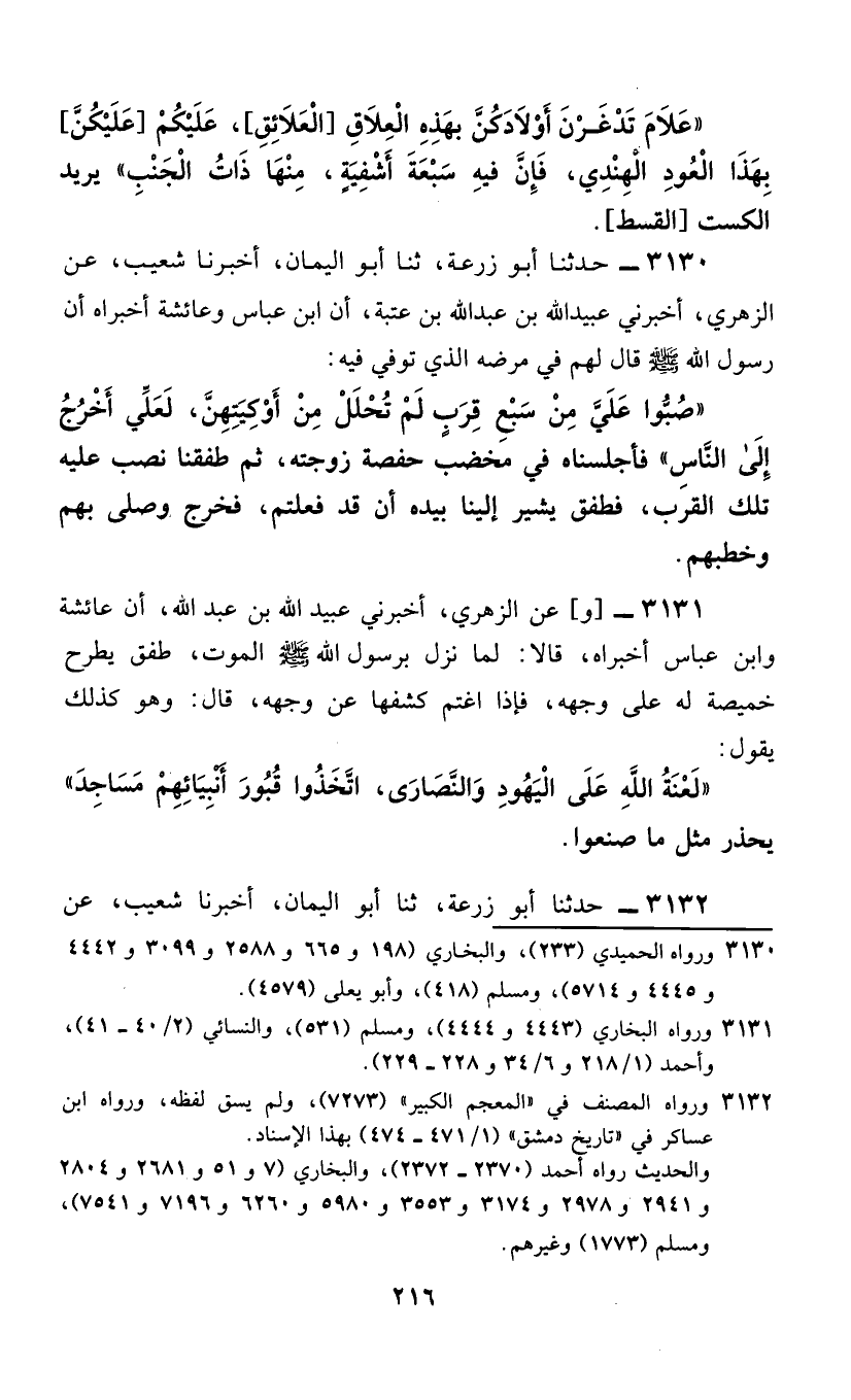 3130 - حَدَّثَنَا أَبُو زُرْعَةَ، ثَنَا أَبُو الْيَمَانِ، أَخْبَرَنَا شُعَيْبٌ، عَنِ الزُّهْرِيِّ، أَخْبَرَنِي عُبَيْدُ اللَّهِ بْنُ عَبْدِ اللَّهِ بْنِ عُتْبَةَ، أَنَّ ابْنَ عَبَّاسٍ، وَعَائِشَةَ، أَخْبَرَاهُ أَنَّ رَسُولَ اللَّهِ صَلَّى اللهُ عَلَيْهِ وَسَلَّمَ قَالَ لَهُمْ فِي مَرَضِهِ الَّذِي تُوُفِّيَ فِيهِ: §«صُبُّوا عَلَيَّ مِنْ سَبْعِ قِرَبٍ لَمْ تُحْلَلْ مِنْ أَوْكِيَتِهِنَّ، لَعَلِّي أَخْرَجُ إِلَى النَّاسِ» فَأَجْلَسْنَاهُ فِي مِخْضَبِ حَفْصَةَ زَوْجَتَهُ، ثُمَّ طَفِقْنَا نَصُبُّ عَلَيْهِ تِلْكَ الْقِرَبِ، فَطَفِقَ يُشِيرُ إِلَيْنَا بِيَدِهِ أَنْ قَدْ فَعَلْتُمْ، فَخَرَجَ وَصَلَّى بِهِمْ وَخَطَبَهُمْ