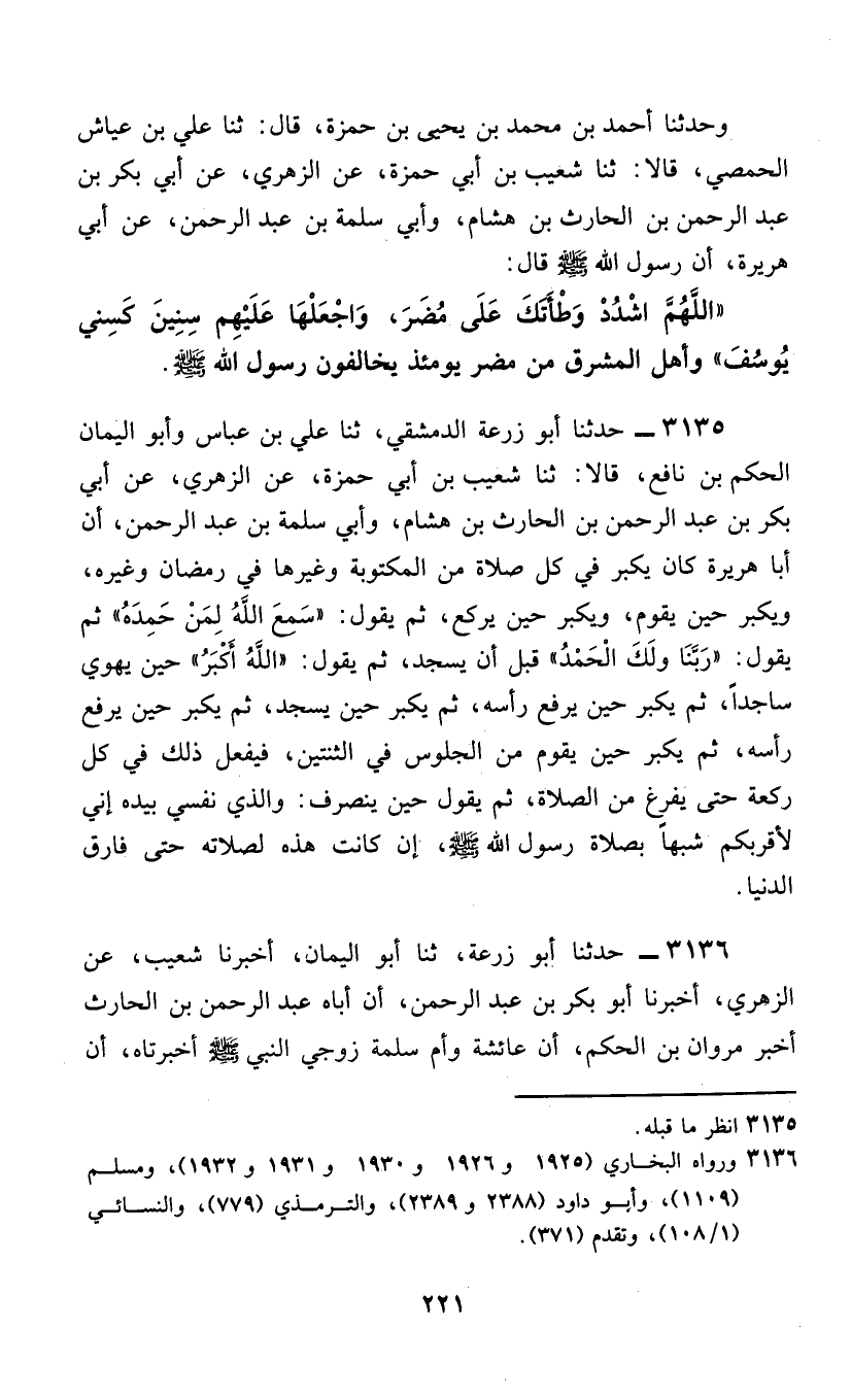 3135 - حَدَّثَنَا أَبُو زُرْعَةَ الدِّمَشْقِيُّ، ثَنَا عَلِيُّ بْنُ عَيَّاشٍ، وَأَبُوالْيَمَانِ الْحَكَمُ بْنُ نَافِعٍ، قَالَا: ثَنَا شُعَيْبُ بْنُ أَبِي حَمْزَةَ، عَنِ الزُّهْرِيِّ، عَنْ أَبِي بَكْرِ بْنِ عَبْدِ الرَّحْمَنِ بْنِ الْحَارِثِ بْنِ هِشَامٍ، وَأَبِي سَلَمَةَ بْنِ عَبْدِ الرَّحْمَنِ، أَنَّ أَبَا هُرَيْرَةَ، كَانَ §يُكَبِّرُ فِي كُلِّ صَلَاةٍ مِنَ الْمَكْتُوبَةَ وَغَيْرِهَا فِي رَمَضَانَ وَغَيْرِهِ، وَيُكَبِّرُ حِينَ يَقُومُ، وَيُكَبِّرُ حِينَ يَرْكَعُ، ثُمَّ يَقُولُ: «سَمِعَ اللَّهَ لِمَنْ حَمِدَهُ» ثُمَّ يَقُولُ: «رَبَّنَا وَلَكَ الْحَمْدُ» قَبْلَ أَنْ يَسْجُدَ، ثُمَّ يَقُولُ: «اللَّهُ أَكْبَرُ» حِينَ يَهْوِي سَاجِدًا، ثُمَّ يُكَبِّرُ حِينَ يَرْفَعُ رَأْسَهُ، ثُمَّ يُكَبِّرُ حِينَ يَسْجُدُ، ثُمَّ يُكَبِّرُ حِينَ يَرْفَعُ رَأْسَهُ، ثُمَّ يُكَبِّرُ حِينَ يَقُومُ مِنَ الْجُلُوسِ فِي الثِّنْتَيْنِ، فَيَفْعَلُ ذَلِكَ فِي كُلِّ رَكْعَةٍ حَتَّى يَفْرُغَ مِنَ الصَّلَاةِ، ثُمَّ يَقُولُ حِينَ يَنْصَرِفُ: «وَالَّذِي نَفْسِي بِيَدِهِ، إِنِّي لَأَقْرَبُكُمْ شَبَهًا بِصَلَاةِ رَسُولِ اللَّهِ صَلَّى اللهُ عَلَيْهِ وَسَلَّمَ، إِنْ كَانَتْ هَذِهِ لِصَلَاتِهِ حَتَّى فَارَقَ الدُّنْيَا»