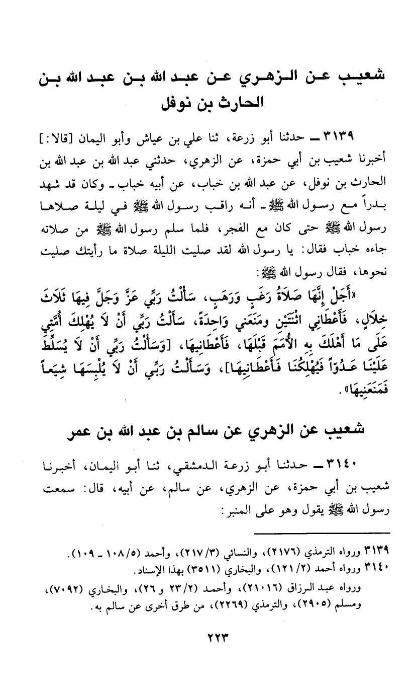 3139 - حَدَّثَنَا أَبُو زُرْعَةَ، ثَنَا عَلِيُّ بْنُ عَيَّاشٍ، وَأَبُو الْيَمَانِ، قَالَا: أَخْبَرَنَا شُعَيْبُ بْنُ أَبِي حَمْزَةَ، عَنِ الزُّهْرِيِّ، حَدَّثَنِي عَبْدُ اللَّهِ بْنُ عَبْدِ اللَّهِ بْنِ الْحَارِثِ بْنِ نَوْفَلٍ، عَنْ عَبْدِ اللَّهِ بْنِ خَبَّابٍ، عَنْ أَبِيهِ، خَبَّابٍ - وَكَانَ قَدْ شَهِدَ بَدْرًا مَعَ رَسُولِ اللَّهِ صَلَّى اللهُ عَلَيْهِ وَسَلَّمَ - أَنَّهُ رَاقَبَ رَسُولَ اللَّهِ صَلَّى اللهُ عَلَيْهِ وَسَلَّمَ فِي لَيْلَةٍ صَلَّاهَا رَسُولُ اللَّهِ صَلَّى اللهُ عَلَيْهِ وَسَلَّمَ حَتَّى كَانَ مَعَ الْفَجْرُ، فَلَمَّا سَلَّمَ رَسُولُ اللَّهِ صَلَّى اللهُ عَلَيْهِ وَسَلَّمَ مِنْ صَلَاتِهِ جَاءَهُ خَبَّابٌ، فَقَالَ: يَا رَسُولَ اللَّهِ لَقَدْ صَلَّيْتَ اللَّيْلَةَ صَلَاةً مَا رَأَيْتُكَ صَلَّيْتَ نَحْوَهَا، فَقَالَ رَسُولُ اللَّهِ صَلَّى اللهُ عَلَيْهِ وَسَلَّمَ: «أَجَلْ، إِنَّهَا §صَلَاةُ رَغَبٍ وَرَهَبٍ، سَأَلْتُ رَبِّي عَزَّ وَجَلَّ فِيهَا ثَلَاثَ خِلَالٍ، فَأَعْطَانِي اثْنَتَيْنِ وَمَنَعَنِي وَاحِدَةً، سَأَلْتُ رَبِّي أَنْ لَا يُهْلِكَ أُمَّتِي عَلَى مَا أَهْلِكَ بِهِ الْأُمَمَ قَبْلَهَا، فَأَعْطَانِيهَا، [وَسَأَلْتُ رَبِّي أَنْ لَا يُسَلَّطَ عَلَيْنَا عَدُوًّا فَيُهْلِكَنَا فَأَعْطَانِيهَا] ، وَسَأَلْتُ رَبِّي أَنْ لَا يُلْبِسَهَا شِيَعًا فَمَنَعَنِيهَا»
