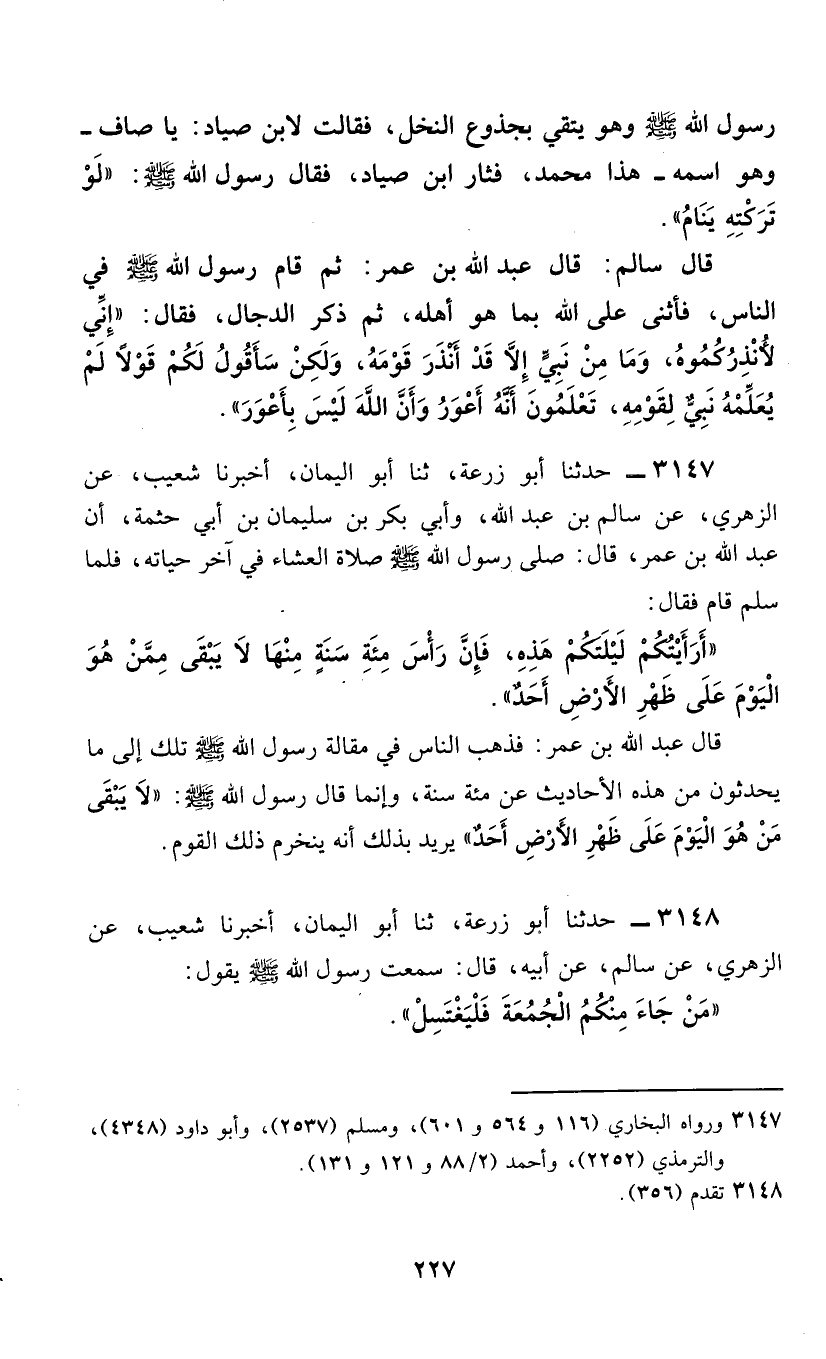 3147 - حَدَّثَنَا أَبُو زُرْعَةَ: ثَنَا أَبُو الْيَمَانِ، أَخْبَرَنَا شُعَيْبٌ، عَنِ الزُّهْرِيِّ، عَنْ سَالِمِ بْنِ عَبْدِ اللَّهِ، وَأَبِي بَكْرِ بْنِ سُلَيْمَانَ بْنِ أَبِي حَثْمَةَ، أَنَّ عَبْدَ اللَّهِ بْنَ عُمَرَ، قَالَ: صَلَّى رَسُولُ اللَّهِ صَلَّى اللهُ عَلَيْهِ وَسَلَّمَ صَلَاةَ الْعِشَاءِ فِي آخِرِ حَيَاتِهِ، فَلَمَّا سَلَّمَ قَامَ، فَقَالَ: «§أَرَأَيْتُكُمْ لَيْلَتَكُمْ هَذِهِ، فَإِنَ رَأْسَ مِائَةِ سَنَةٍ مِنْهَا لَا يَبْقَى مِمَّنْ هُوَ الْيَوْمَ عَلَى ظَهْرِ الْأَرْضِ أَحَدٌ» قَالَ عَبْدُ اللَّهِ بْنُ عُمَرَ: فَذَهَبَ النَّاسُ فِي مَقَالَةِ رَسُولِ اللَّهِ صَلَّى اللهُ عَلَيْهِ وَسَلَّمَ تِلْكَ إِلَى مَا يُحَدِّثُونَ مِنْ هَذِهِ الْأَحَادِيثِ عَنْ مِئَةِ سَنَةٍ، وَإِنَّمَا قَالَ رَسُولُ اللَّهِ صَلَّى اللهُ عَلَيْهِ وَسَلَّمَ: «لَا يَبْقَى مَنْ هُوَ الْيَوْمَ عَلَى ظَهْرِ الْأَرْضِ أَحَدٌ» يُرِيدُ بِذَلِكَ أَنَّهُ يَنْخَرِمُ ذَلِكَ الْقَوْمُ