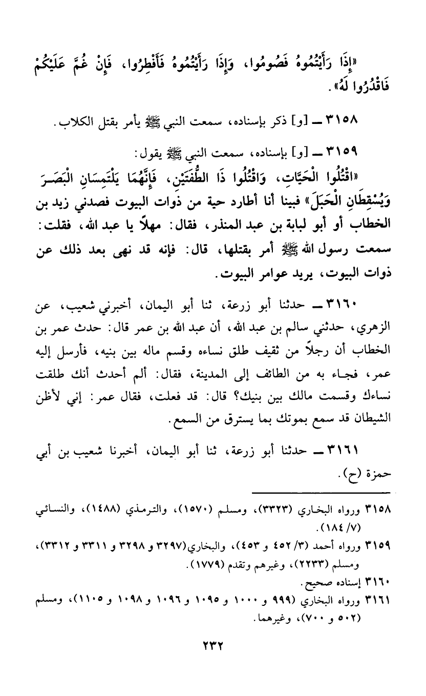 3159 - وَبِإِسْنَادِهِ، سَمِعْتُ النَّبِيَّ صَلَّى اللهُ عَلَيْهِ وَسَلَّمَ يَقُولُ: «§اقْتُلُوا الْحَيَّاتِ، وَاقْتُلُوا ذَا الطُّفْيَتَيْنِ، فَإِنَّهُمَا يَلْتَمِسَانِ الْبَصَرَ وَيُسْقِطَانِ الْحَبَلَ» فَبَيْنَا أَنَا طَارِدُ حَيَّةٍ مِنْ ذَوَاتِ الْبُيُوتِ فَصَدَّنِي زَيْدُ بْنُ الْخَطَّابِ أَوْ أَبُو لُبَابَةَ بْنُ عَبْدِ الْمُنْذِرِ، فَقَالَ: مَهْلًا يَا عَبْدَ اللَّهِ، فَقُلْتُ: سَمِعْتُ رَسُولَ اللَّهِ صَلَّى اللهُ عَلَيْهِ وَسَلَّمَ أَمَرَ بِقَتْلِهَا، قَالَ: فَإِنَّهُ قَدْ نَهَى بَعْدَ ذَلِكَ عَنْ ذَوَاتِ الْبُيُوتِ، يُرِيدُ عَوَامِرَ الْبُيُوتِ