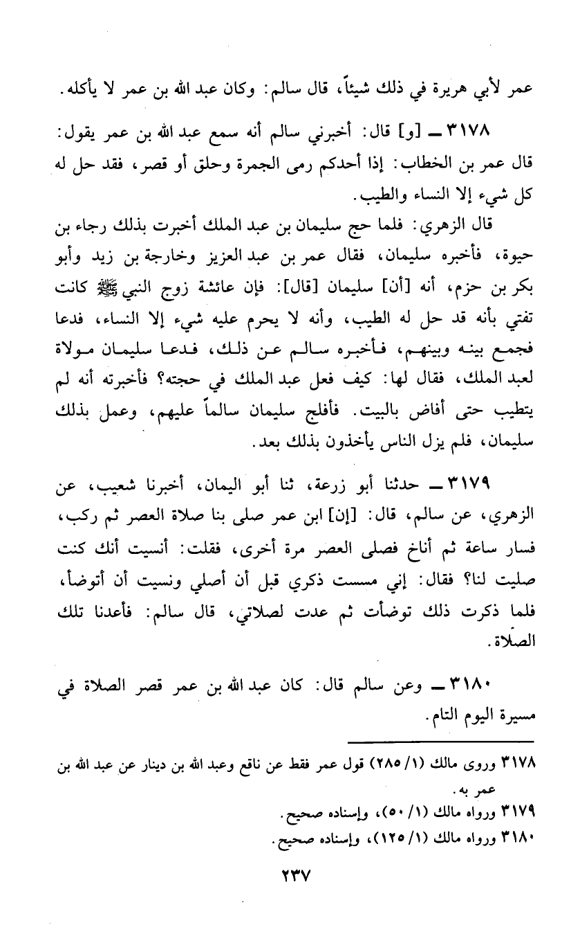 3178 - وَقَالَ: أَخْبَرَنِي سَالِمٌ، أَنَّهُ سَمِعَ عَبْدَ اللَّهِ بْنَ عُمَرَ، يَقُولُ: قَالَ عُمَرُ بْنُ الْخَطَّابِ: «§إِذَا أَحَدُكُمْ رَمَى الْجَمْرَةَ وَحَلَقَ أَوْ قَصَّرَ، فَقَدْ حَلَّ لَهُ كُلُّ شَيْءٍ إِلَّا النِّسَاءَ وَالطِّيبَ» قَالَ الزُّهْرِيُّ: فَلَمَّا حَجَّ سُلَيْمَانُ بْنُ عَبْدِ الْمَلِكِ أَخْبَرْتُ بِذَلِكَ رَجَاءَ بْنَ حَيْوَةَ، فَأَخْبَرَهُ سُلَيْمَانُ، فَقَالَ عُمَرُ بْنُ عَبْدِ الْعَزِيزِ وَخَارِجَةُ بْنُ زَيْدٍ وَأَبُو بَكْرِ بْنِ حَزْمٍ، أَنَّهُ [أَنَّ] سُلَيْمَانَ [قَالَ] : فَإِنَّ عَائِشَةَ زَوْجَ النَّبِيِّ صَلَّى اللهُ عَلَيْهِ وَسَلَّمَ كَانَتْ تُفْتِي بِأَنَّهُ قَدْ حَلَّ لَهُ الطِّيبَ، وَأَنَّهُ لَا يَحْرُمُ عَلَيْهِ شَيْءٌ إِلَّا النِّسَاءَ، فَدَعَا، فَجَمَعَ بَيْنَهُ وَبَيْنَهُمْ، فَأَخْبَرَهُ سَالِمٌ عَنْ ذَلِكَ، فَدَعَا سُلَيْمَانُ مَوْلَاةً لِعَبْدِ الْمَلِكِ، فَقَالَ لَهَا: كَيْفَ فَعَلَ عَبْدُ الْمَلِكِ فِي حَجَّتِهِ؟ فَأَخْبَرْتُهُ أَنَّهُ لَمْ يَتَطَيَّبْ حَتَّى أَفَاضَ بِالْبَيْتِ فَأَفْلَجَ سُلَيْمَانُ سَالِمًا عَلَيْهِمْ، وَعَمِلَ بِذَلِكَ سُلَيْمَانُ، فَلَمْ يَزَلِ النَّاسُ يَأْخُذُونَ بِذَلِكَ بَعْدُ