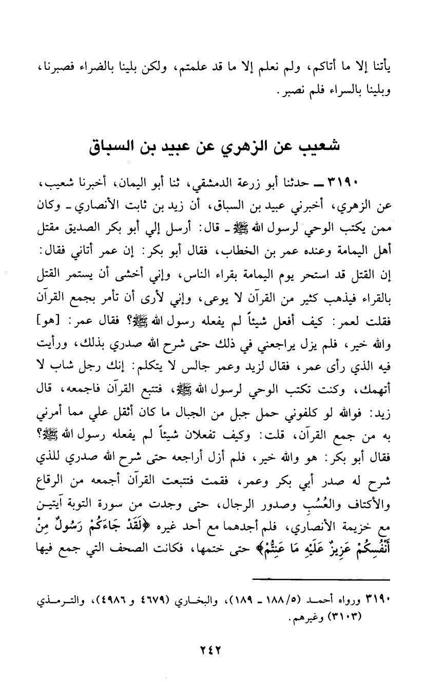 3190 - حَدَّثَنَا أَبُو زُرْعَةَ الدِّمَشْقِيُّ، ثَنَا أَبُو الْيَمَانِ، أَخْبَرَنَا شُعَيْبٌ، عَنِ الزُّهْرِيِّ، أَخْبَرَنِي عُبَيْدُ بْنُ السَّبَّاقِ، أَنَّ زَيْدَ بْنَ ثَابِتٍ الْأَنْصَارِيَّ، - وَكَانَ مِمَّنْ يَكْتُبُ الْوَحْيَ لِرَسُولِ اللَّهِ صَلَّى اللهُ عَلَيْهِ وَسَلَّمَ - قَالَ: أَرْسِلَ إِلَيَّ أَبُو بَكْرٍ الصِّدِّيقُ مَقْتَلَ أَهْلِ الْيَمَامَةِ وَعِنْدَهُ عُمَرُ بْنُ الْخَطَّابِ، فَقَالَ أَبُو بَكْرٍ: إِنَّ عُمَرَ أَتَانِي فَقَالَ: «إِنَّ §الْقَتْلَ قَدِ اسْتَحَرَّ يَوْمَ الْيَمَامَةِ بِقُرَّاءِ النَّاسِ، وَإِنِّي أَخْشَى أَنْ يَسْتَمِرَّ الْقَتْلُ بِالْقُرَّاءِ؛ فَيَذْهَبَ كَثِيرٌ مِنَ الْقُرْآنِ لَا يُوعَى، وَإِنِّي لَأَرَى أَنْ تَأْمُرَ بِجَمْعِ الْقُرْآنِ» فَقُلْتُ لِعُمَرَ: كَيْفَ أَفْعَلُ شَيْئًا لَمْ يَفْعَلْهُ رَسُولُ اللَّهِ صَلَّى اللهُ عَلَيْهِ وَسَلَّمَ "؟ فَقَالَ عُمَرُ: « [هُوَ] وَاللَّهِ خَيْرٌ» ، فَلَمْ يَزَلْ يُرَاجِعُنِي فِي ذَلِكَ حَتَّى شَرَحَ اللَّهُ صَدْرِي بِذَلِكَ، وَرَأَيْتُ فِيهِ الَّذِي رَأَى عُمَرُ، فَقَالَ لِزَيْدٍ وَعُمَرُ جَالِسٌ لَا يَتَكَلَّمُ: «إِنَّكَ رَجُلٌ شَابٌّ لَا أَتَّهِمُكَ، وَكُنْتَ تَكْتُبُ الْوَحْيَ لِرَسُولِ اللَّهِ صَلَّى اللهُ عَلَيْهِ وَسَلَّمَ، فَتَتَبَّعَ الْقُرْآنَ فَاجْمَعْهُ» ، قَالَ زَيْدٌ: «فَوَاللَّهِ لَوْ كَلَّفُونِي حَمَلَ جَبَلٍ مِنَ الْجِبَالِ مَا كَانَ أَثْقَلَ عَلَيَّ مِمَّا أَمَرَنِي بِهِ مِنْ جَمَعِ الْقُرْآنِ» ، قُلْتُ: «وَكَيْفَ تَفْعَلَانِ شَيْئًا لَمْ يَفْعَلْهُ رَسُولُ اللَّهِ صَلَّى اللهُ عَلَيْهِ وَسَلَّمَ» ؟ فَقَالَ أَبُو بَكْرٍ: «هُوَ وَاللَّهِ خَيْرٌ» ، فَلَمْ أَزَلْ أُرَاجِعُهُ حَتَّى شَرَحَ اللَّهُ صَدْرِي لِلَّذِي شَرَحَ لَهُ صَدْرُ أَبِي بَكْرٍ وَعُمَرَ، فَقُمْتُ فَتَتَبَّعْتُ الْقُرْآنَ أَجْمَعُهُ مِنَ الرِّقَاعِ وَالْأَكْتَافِ وَالْعُسُبِ وَصُدُورِ الرِّجَالِ، حَتَّى وَجَدْتُ مِنْ سُورَةِ التَّوْبَةِ آيَتَيْنِ مَعَ خُزَيْمَةَ الْأَنْصَارِيِّ، فَلَمْ أَجِدْهُمَا مَعَ أَحَدٍ غَيْرِهِ {لَقَدْ جَاءَكُمْ رَسُولٌ مِنْ أَنْفُسِكُمْ عَزِيزٌ عَلَيْهِ مَا عَنِتُّمْ} [التوبة: 128] حَتَّى خَتَمَهَا، فَكَانَتِ الصُّحُفُ الَّتِي جَمَعَ فِيهَا -[243]- الْقُرْآنَ عِنْدَ أَبِي بَكْرٍ حَتَّى تَوَفَّاهُ اللَّهُ، ثُمَّ عِنْدَ عُمَرَ حَتَّى تَوَفَّاهُ اللَّهُ، ثُمَّ عِنْدَ حَفْصَةَ بِنْتِ عُمَرَ رَضِيَ اللَّهُ عَنْهُمْ