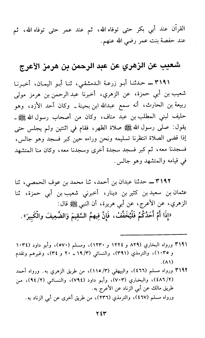 3192 - حَدَّثَنَا عَبْدَانُ بْنُ أَحْمَدَ، ثَنَا مُحَمَّدُ بْنُ عَوْفٍ الْحِمْصِيُّ، ثَنَا عُثْمَانُ بْنُ سَعِيدِ بْنِ كَثِيرِ بْنِ دِينَارٍ، أَخْبَرَنِي شُعَيْبُ بْنُ أَبِي حَمْزَةَ، ثَنَا الزُّهْرِيُّ، عَنِ الْأَعْرَجِ، عَنْ أَبِي هُرَيْرَةَ، أَنَّ النَّبِيَّ صَلَّى اللهُ عَلَيْهِ وَسَلَّمَ قَالَ: §«إِذَا أَمَّ أَحَدُكُمْ فَلْيُخَفِّفْ؛ فَإِنَّ فِيهِمُ السَّقِيمَ وَالضَّعِيفَ وَالْكَبِيرَ»