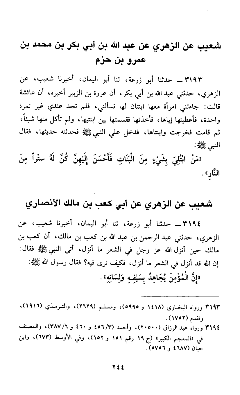 3194 - حَدَّثَنَا أَبُو زُرْعَةَ، ثَنَا أَبُو الْيَمَانِ، أَخْبَرَنَا شُعَيْبٌ، عَنِ الزُّهْرِيِّ، حَدَّثَنِي عَبْدُ الرَّحْمَنِ بْنُ عَبْدِ اللَّهِ بْنِ كَعْبِ بْنِ مَالِكٍ، أَنَّ كَعْبَ بْنَ مَالِكٍ، حِينَ أَنْزَلَ اللَّهُ عَزَّ وَجَلَّ فِي الشِّعْرِ مَا أَنْزَلَ، أَتَى النَّبِيَّ صَلَّى اللهُ عَلَيْهِ وَسَلَّمَ فَقَالَ: إِنَّ اللَّهَ قَدْ أَنْزَلَ فِي الشَّعْرِ مَا أَنْزَلَ، فَكَيْفَ تَرَى فِيهِ؟ فَقَالَ رَسُولُ اللَّهِ صَلَّى اللهُ عَلَيْهِ وَسَلَّمَ: §«إِنَّ الْمُؤْمِنَ يُجَاهِدُ بِسَيْفِهِ وَلِسَانِهِ»