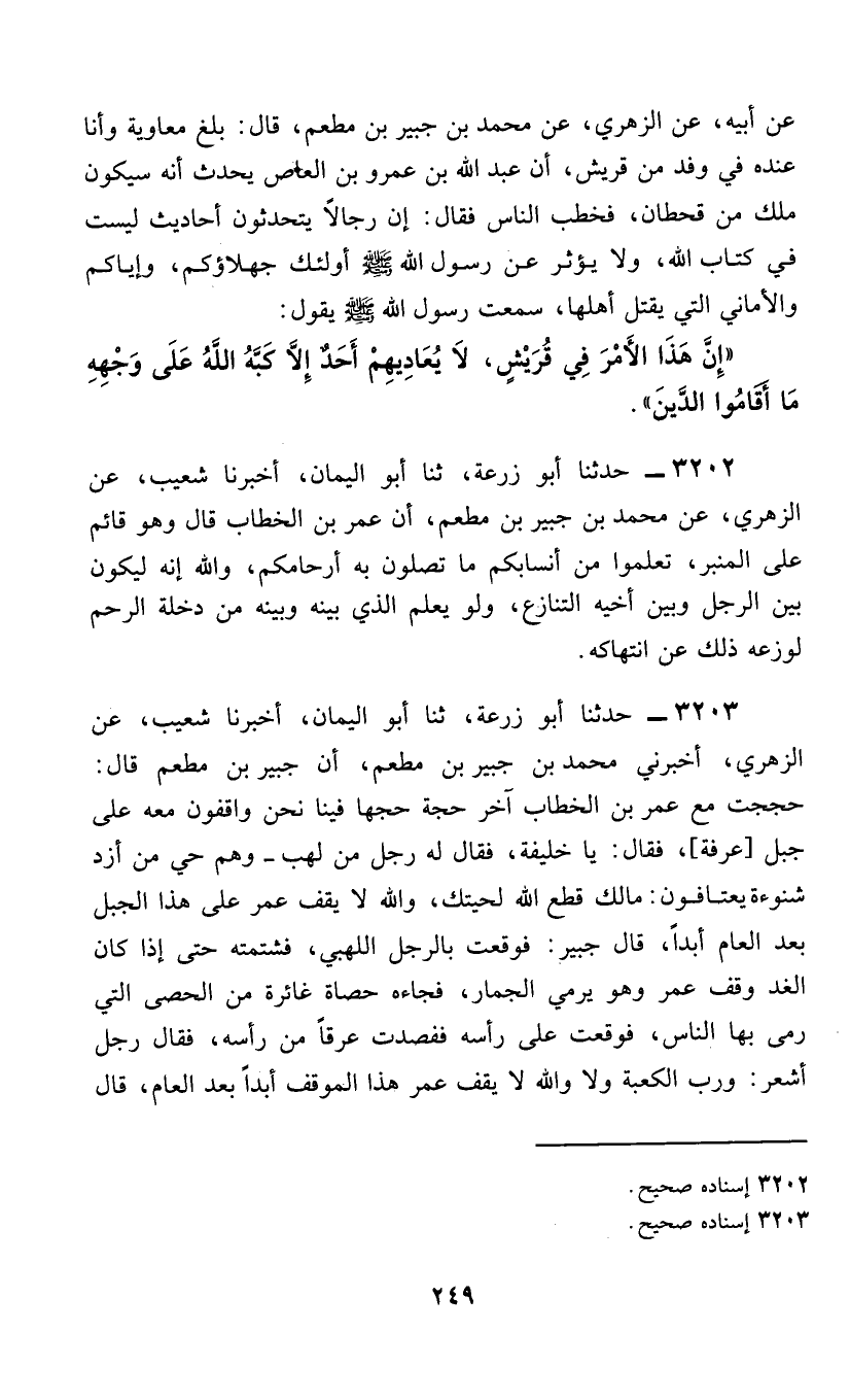 3203 - حَدَّثَنَا أَبُو زُرْعَةَ، ثَنَا أَبُو الْيَمَانِ، أَخْبَرَنَا شُعَيْبٌ، عَنِ الزُّهْرِيِّ، أَخْبَرَنِي مُحَمَّدُ بْنُ جُبَيْرِ بْنِ مُطْعِمٍ، أَنَّ جُبَيْرَ بْنَ مُطْعِمٍ، قَالَ: §" حَجَجْتُ مَعَ عُمَرَ بْنِ الْخَطَّابِ آخِرَ حَجَّةٍ حَجَّهَا فَبَيْنَا نَحْنُ وَاقِفُونَ مَعَهُ عَلَى جَبَلِ [عَرَفَةَ] ، فَقَالَ: يَا خَلِيفَةُ، فَقَالَ لَهُ رَجُلٌ مِنْ لِهْبٍ - وَهُمْ حَيٌّ مِنْ أَزْدِ شَنُوءَةَ يَعْتَافُونَ: مَا لَكَ قَطَعَ اللَّهُ لِحْيَتَكَ، وَاللَّهِ لَا يَقِفُ عُمَرُ عَلَى هَذَا الْجَبَلِ بَعْدَ الْعَامِ أَبَدًا، قَالَ جُبَيْرٌ: فَوَقَعَتُ بِالرَّجُلِ اللِّهْبِيِّ، فَشَتَمْتُهُ حَتَّى إِذَا كَانَ الْغَدُ وَقَفَ عُمَرُ وَهُوَ يَرْمِي الْجِمَارَ، فَجَاءَهُ حَصَاةٌ غَائِرَةٌ مِنَ الْحَصَى الَّتِي رَمَى بِهَا النَّاسُ، فَوَقَعَتْ عَلَى رَأْسِهِ فَفَصَدَتْ عِرْقًا مِنْ رَأْسِهِ، فَقَالَ رَجُلٌ أَشْعَرَ: وَرَبِّ الْكَعْبَةِ، وَلَا وَاللَّهِ لَا يَقِفُ عُمَرُ هَذَا الْمَوْقِفَ أَبَدًا بَعْدَ الْعَامِ، قَالَ -[250]- جُبَيْرٌ: فَذَهَبْتُ أَلْتَفِتُ فَإِذَا هُوَ اللِّهْبِيُّ الَّذِي قَالَ لِعُمَرَ عَلَى جَبَلِ عَرَفَةَ مَا قَالَ "