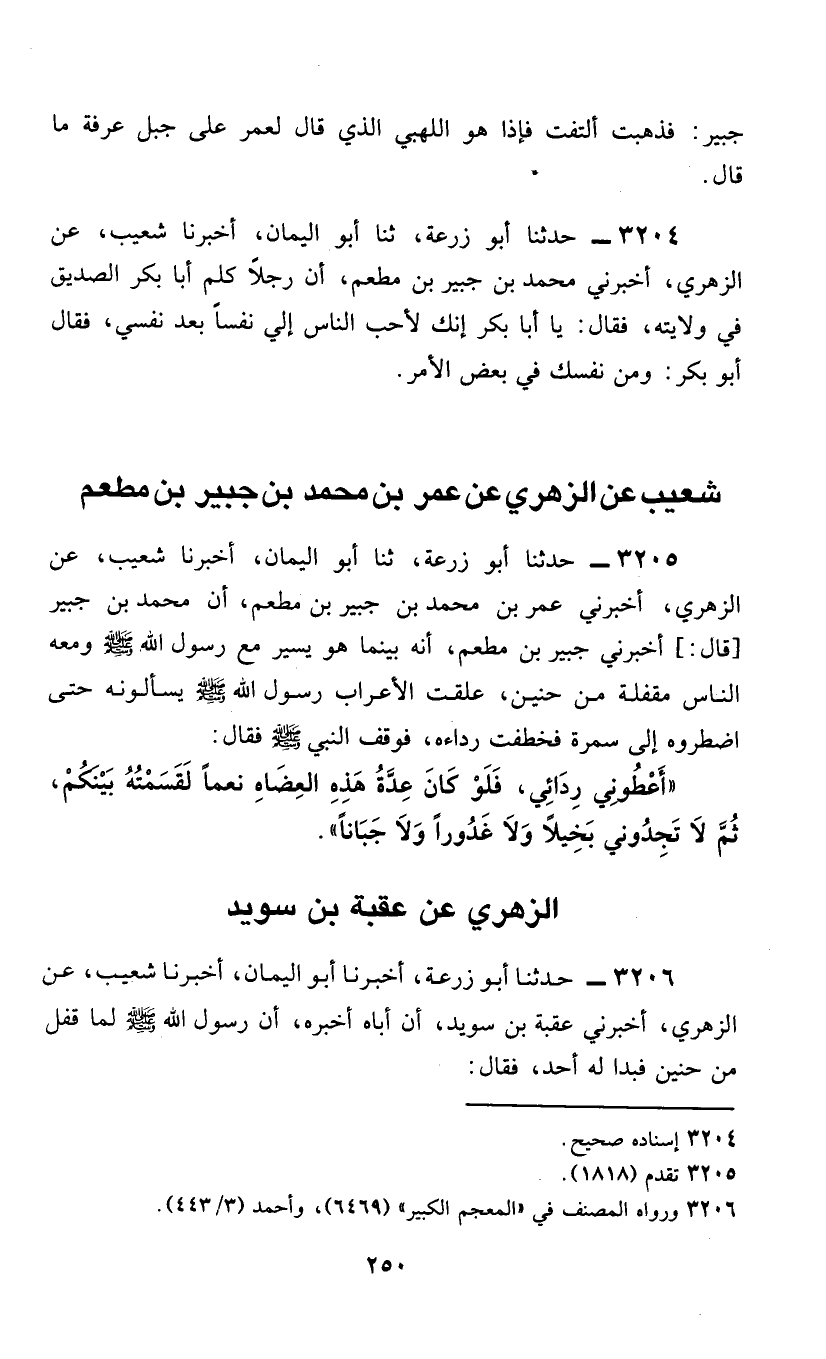 3205 - حَدَّثَنَا أَبُو زُرْعَةَ، ثَنَا أَبُو الْيَمَانِ، أَخْبَرَنَا شُعَيْبٌ، عَنِ الزُّهْرِيِّ، أَخْبَرَنِي عُمَرُ بْنُ مُحَمَّدِ بْنِ جُبَيْرِ بْنِ مُطْعِمٍ، أَنَّ مُحَمَّدَ بْنَ جُبَيْرٍ، قَالَ: أَخْبَرَنِي جُبَيْرُ بْنُ مُطْعِمٍ، أَنَّهُ بَيْنَمَا هُوَ يَسِيرُ مَعَ رَسُولِ اللَّهِ صَلَّى اللهُ عَلَيْهِ وَسَلَّمَ وَمَعَهُ النَّاسُ مُقْفِلَةٌ مِنْ حُنَيْنٍ، عَلَّقَتِ الْأَعْرَابُ رَسُولَ اللَّهِ صَلَّى اللهُ عَلَيْهِ وَسَلَّمَ يَسْأَلُونَهُ حَتَّى اضْطَرُّوهُ إِلَى سَمُرَةَ فَخَطَفْتُ رِدَاءَهُ، فَوَقَفَ النَّبِيُّ صَلَّى اللهُ عَلَيْهِ وَسَلَّمَ فَقَالَ: «§أَعْطُونِي رِدَائِي، فَلَوْ كَانَ عِدَّةُ هَذِهِ الْعِضَاهِ نَعَمًا لَقَسَمْتُهُ بَيْنَكُمْ، ثُمَّ لَا تَجِدُونِي بَخِيلًا وَلَا غَدُورًا وَلَا جَبَانًا»