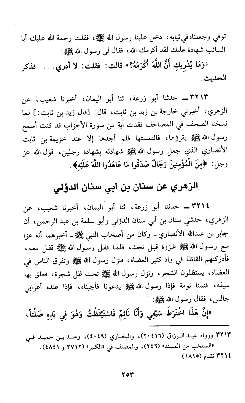 3214 - حَدَّثَنَا أَبُو زُرْعَةَ، ثَنَا أَبُو الْيَمَانِ، أَخْبَرَنَا شُعَيْبٌ، عَنِ الزُّهْرِيِّ، حَدَّثَنِي سِنَانُ بْنُ أَبِي سِنَانٍ الدُّؤَلِيِّ، وَأَبُو سَلَمَةَ بْنُ عَبْدِ الرَّحْمَنِ، أَنَّ جَابِرَ بْنَ عَبْدِ اللَّهِ الْأَنْصَارِيَّ - وَكَانَ مِنْ أَصْحَابِ النَّبِيِّ صَلَّى اللهُ عَلَيْهِ وَسَلَّمَ - أَخْبَرَهُمَا أَنَّهُ غَزَا مَعَ رَسُولِ اللَّهِ صَلَّى اللهُ عَلَيْهِ وَسَلَّمَ غَزْوَةً قَبْلَ نَجْدٍ، فَلَمَّا قَفَلَ رَسُولُ اللَّهِ صَلَّى اللهُ عَلَيْهِ وَسَلَّمَ قَفَلَ مَعَهُ، فَأَدْرَكَتْهُمُ الْقَائِلَةُ فِي وَادٍ كَثِيرِ الْعِضَاهِ، فَنَزَلَ رَسُولُ اللَّهِ صَلَّى اللهُ عَلَيْهِ وَسَلَّمَ وَتَفَرَّقَ النَّاسُ فِي الْعِضَاهِ، يَسْتَظِلُّونَ الشَّجَرَ، وَنَزَلَ رَسُولُ اللَّهِ صَلَّى اللهُ عَلَيْهِ وَسَلَّمَ تَحْتَ ظِلِّ شَجَرَةٍ، فَعَلَّقَ بِهَا سَيْفَهُ، فَنِمْنَا نَوْمَةً، فَإِذَا رَسُولُ اللَّهِ صَلَّى اللهُ عَلَيْهِ وَسَلَّمَ يَدْعُونَا فَأَجَبْنَاهُ، فَإِذَا عِنْدَهُ أَعْرَابِيٌّ جَالِسٌ، فَقَالَ رَسُولُ اللَّهِ صَلَّى اللهُ عَلَيْهِ وَسَلَّمَ: " إِنَّ §هَذَا اخْتَرَطَ سَيْفِي وَأَنَا نَائِمٌ فَاسْتَيْقَظْتُ وَهُوَ فِي يَدِهِ صَلْتًا -[254]-، فَقَالَ: مَا يَمْنَعُكَ مِنِّي؟ فَقُلْتُ: اللَّهُ، فَشَامَ السَّيْفَ وَجَلَسَ " فَلَمْ يُعَاقِبْهُ رَسُولُ اللَّهِ صَلَّى اللهُ عَلَيْهِ وَسَلَّمَ وَقَدْ فَعَلَ ذَلِكَ