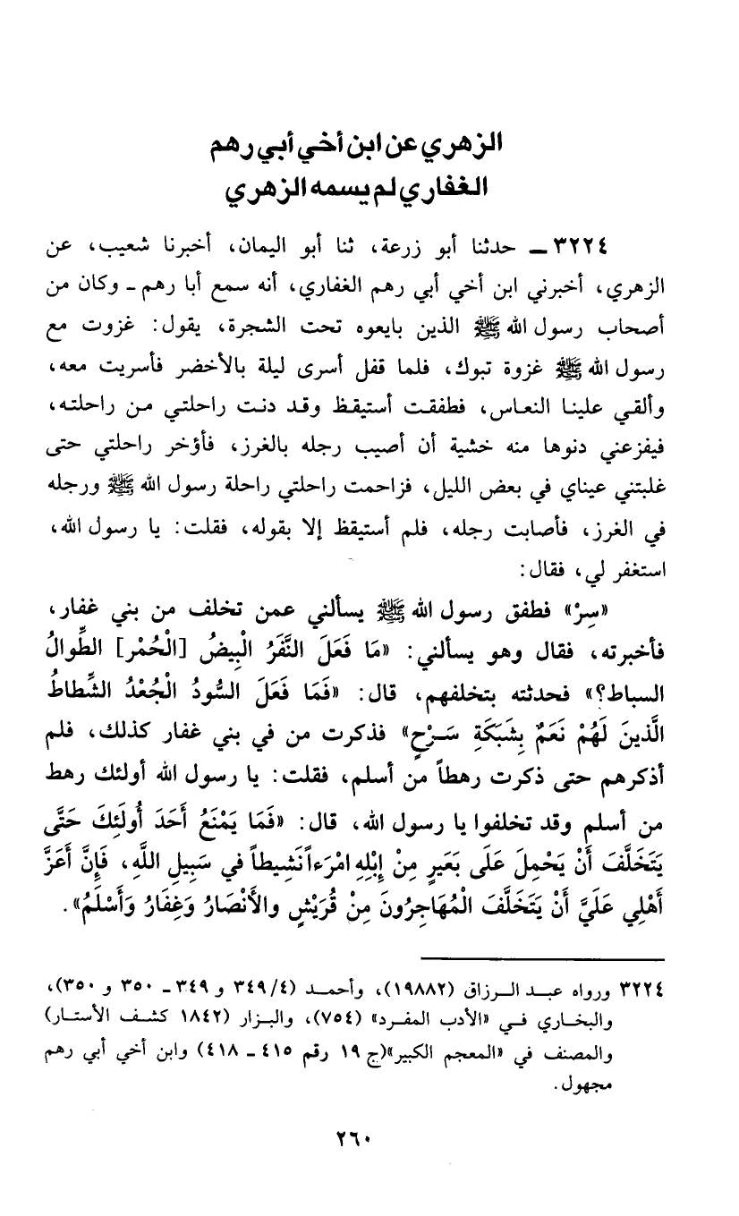 3224 - حَدَّثَنَا أَبُو زُرْعَةَ، ثَنَا أَبُو الْيَمَانِ، أَخْبَرَنَا شُعَيْبٌ، عَنِ الزُّهْرِيِّ، أَخْبَرَنِي ابْنُ أَخِي أَبِي رُهْمٍ الْغِفَارِيُّ، أَنَّهُ سَمِعَ أَبَا رُهْمٍ - وَكَانَ مِنْ أَصْحَابِ رَسُولِ اللَّهِ صَلَّى اللهُ عَلَيْهِ وَسَلَّمَ الَّذِينَ بَايَعُوهُ تَحْتَ الشَّجَرَةِ - يَقُولُ: غَزَوْتُ مَعَ رَسُولِ اللَّهِ صَلَّى اللهُ عَلَيْهِ وَسَلَّمَ غَزْوَةَ تَبُوكٍ، فَلَمَّا قَفَلَ أَسْرَى لَيْلَةً بِالْأَخْضَرِ فَأَسْرَيْتُ مَعَهُ، وَأُلْقِيَ عَلَيْنَا النُّعَاسُ، فَطَفِقْتُ أَسْتَيْقِظُ وَقَدْ دَنَتْ رَاحِلَتِي مِنْ رَاحِلَتِهِ، فَيُفْزِعُنِي دُنُوُّهَا مِنْهُ خَشْيَةَ أَنْ أُصِيبَ رِجْلَهُ بِالْغَرْزِ، فَأُؤَخِّرَ رَاحِلَتِي حَتَّى غَلَبَتْنِي عَيْنَايَ فِي بَعْضِ اللَّيْلِ، فَزَاحَمَتْ رَاحِلَتِي رَاحِلَةَ رَسُولِ اللَّهِ صَلَّى اللهُ عَلَيْهِ وَسَلَّمَ وَرِجْلُهُ فِي الْغَرْزِ، فَأَصَابَتْ رِجْلَهُ، فَلَمْ أَسْتَيْقِظْ إِلَّا بِقَوْلِهِ، فَقُلْتُ: يَا رَسُولَ اللَّهِ، اسْتَغْفِرْ لِي، فَقَالَ: «سِرْ» فَطَفِقَ رَسُولُ اللَّهِ صَلَّى اللهُ عَلَيْهِ وَسَلَّمَ يَسْأَلُنِي عَمَّنْ تَخَلَّفَ مِنْ بَنِي غِفَارٍ، فَأَخْبَرْتُهُ، فَقَالَ وَهُوَ يَسْأَلُنِي: «مَا فَعَلَ النَّفْرُ الْبِيضُ [الْحُمُرُ] الطِّوَالُ السِّبَاطُ؟» فَحَدَّثْتُهُ بِتَخَلُّفِهِمْ، قَالَ: «فَمَا فَعَلَ السُّودُ الْجُعْدُ الشِّطَاطُ الَّذِينَ لَهُمْ نَعَمْ بِشَبَكَةِ سَرْحٍ» فَذَكَرْتُ مَنْ فِي بَنِي غِفَارٍ كَذَلِكَ، فَلَمْ أَذْكُرْهُمْ حَتَّى ذَكَرْتُ رَهْطًا مِنْ أَسْلَمَ، فَقُلْتُ: يَا رَسُولَ اللَّهِ، أُولَئِكَ رَهْطٌ مِنْ أَسْلَمَ وَقَدْ تَخَلَّفُوا يَا رَسُولَ اللَّهِ، قَالَ: §«فَمَا يَمْنَعُ أَحَدٌ أُولَئِكَ حَتَّى يَتَخَلَّفَ أَنْ يَحْمِلَ عَلَى بَعِيرٍ مِنْ إِبِلِهِ امْرَءًا نَشِيطًا فِي سَبِيلِ اللَّهِ، فَإِنَّ أَعَزَّ أَهْلِي عَلَيَّ أَنْ يَتَخَلَّفَ الْمُهَاجِرُونَ مِنْ قُرَيْشٍ وَالْأَنْصَارُ وَغِفَارُ وَأَسْلَمُ»