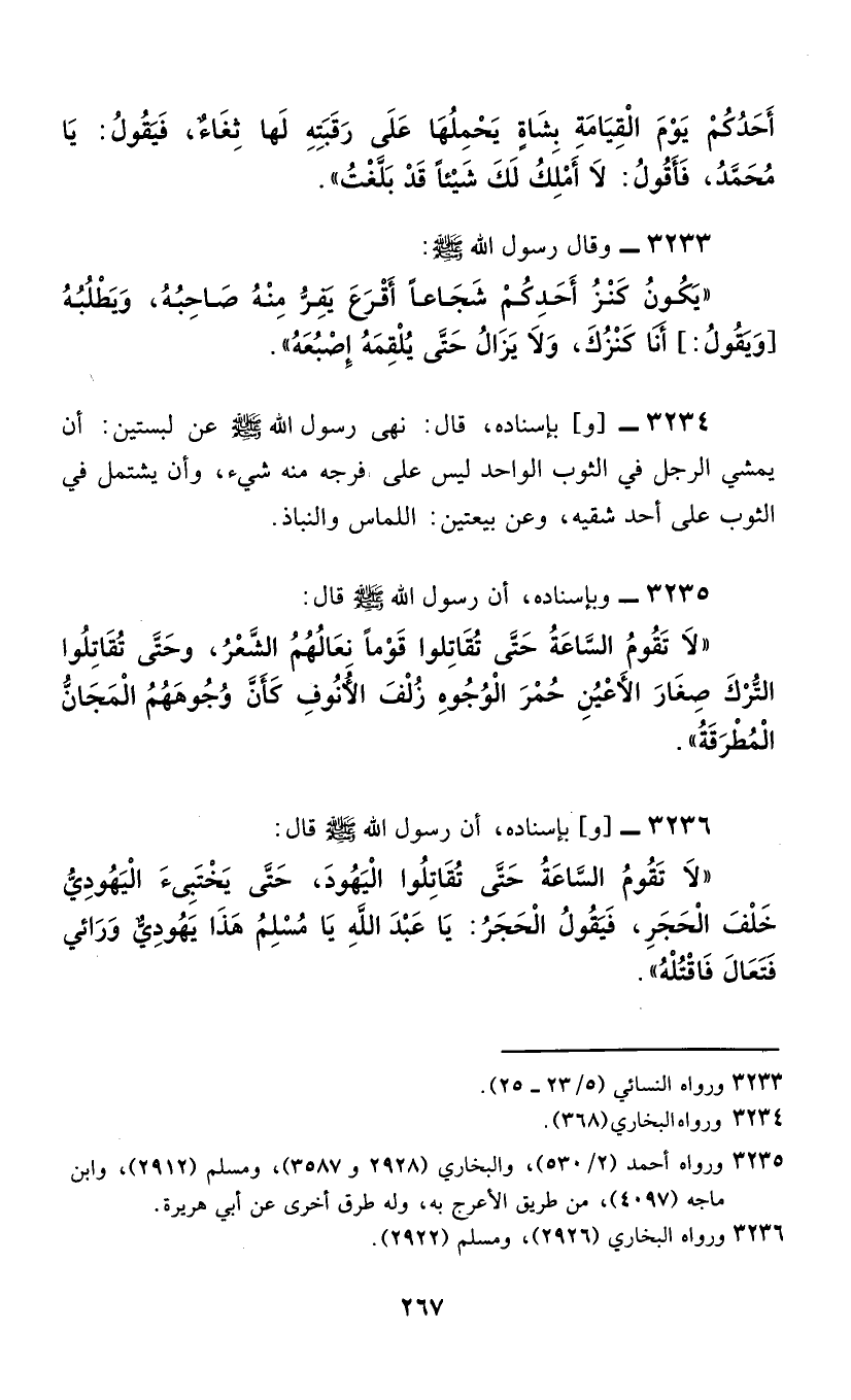 3235 - وَبِإِسْنَادِهِ، أَنَّ رَسُولَ اللَّهِ صَلَّى اللهُ عَلَيْهِ وَسَلَّمَ قَالَ: «§لَا تَقُومُ السَّاعَةُ حَتَّى تُقَاتِلُوا قَوْمًا نِعَالُهُمُ الشَّعْرُ، وَحَتَّى تُقَاتِلُوا التُّرْكَ صِغَارَ الْأَعْيُنِ حُمْرَ الْوُجُوهِ زُلْفَ الْأُنُوفِ كَأَنَّ وُجُوهَهُمُ الْمَجَانُّ الْمُطْرَقَةِ»