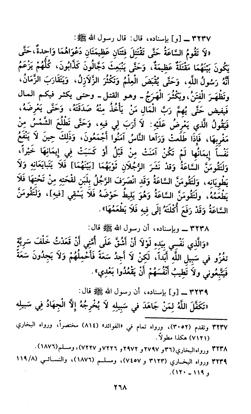 3237 - وَبِإِسْنَادِهِ، قَالَ: قَالَ رَسُولُ اللَّهِ صَلَّى اللهُ عَلَيْهِ وَسَلَّمَ: «§لَا تَقُومُ السَّاعَةُ حَتَّى تَقْتَتِلَ فِئَتَانِ عَظِيمَتَانِ دَعْوَاهُمَا وَاحِدَةٌ، حَتَّى يَكُونَ بَيْنَهُمَا مَقْتَلَةٌ عَظِيمَةٌ، وَحَتَّى يَنْبَعِثَ دَجَّالُونَ كَذَّابُونَ، كُلُّهُمْ يَزْعُمُ أَنَّهُ رَسُولُ اللَّهِ، وَحَتَّى يُقْبَضَ الْعِلْمُ وَتَكْثُرَ الزَّلَازِلُ، وَيَتَقَارَبَ الزَّمَانُ، وَتَظْهَرُ الْفِتَنُ، وَيَكْثُرُ الْهَرْجُ - وَهُوَ الْقَتْلُ - وَحَتَّى يَكْثُرَ فِيكُمُ الْمَالُ فَيَفِيضَ حَتَّى يُهِمَّ رَبَّ الْمَالِ مَنْ يَأْخُذُ مِنْهُ صَدَقَتَهُ» ، وَحَتَّى يَعْرِضَهُ، فَيَقُولُ الَّذِي يَعْرِضُ عَلَيْهِ: لَا أَرَبَ لِي فِيهِ، وَحَتَّى تَطْلُعَ الشَّمْسُ مِنْ مَغْرِبِهَا، فَإِذَا طَلَعَتْ وَرَآهَا النَّاسُ آمَنُوا أَجْمَعُونَ، وَذَلِكَ حِينَ لَا يَنْفَعُ نَفْسًا إِيمَانُهَا لَمْ تَكُنْ آمَنْتْ مِنْ قَبْلُ أَوْ كَسَبَتْ فِي إِيمَانِهَا خَيْرًا، وَلَتَقُومَنَّ السَّاعَةُ وَقَدْ نَشَرَ الرَّجُلَانِ ثَوْبَهُمَا [بَيْنَهُمَا] فَلَا يَتَبَايَعَانِهِ وَلَا يَطْوِيَانِهِ، وَلَتَقُومَنَّ السَّاعَةُ وَقَدِ انْصَرَفَ الرَّجُلُ بِلَبَنِ لِقْحَتِهِ مِنْ تَحْتَهَا فَلَا يَطْعَمُهُ، وَلَتَقُومَنَّ السَّاعَةُ وَهُوَ يَلِيطُ حَوْضَهُ فَلَا يَسْقِي [فِيهِ] ، وَلَتَقُومَنَّ السَّاعَةُ وَقَدْ رَفَعَ أُكْلَتُهُ إِلَى فِيهِ فَلَا يَطْعَمُهَا"