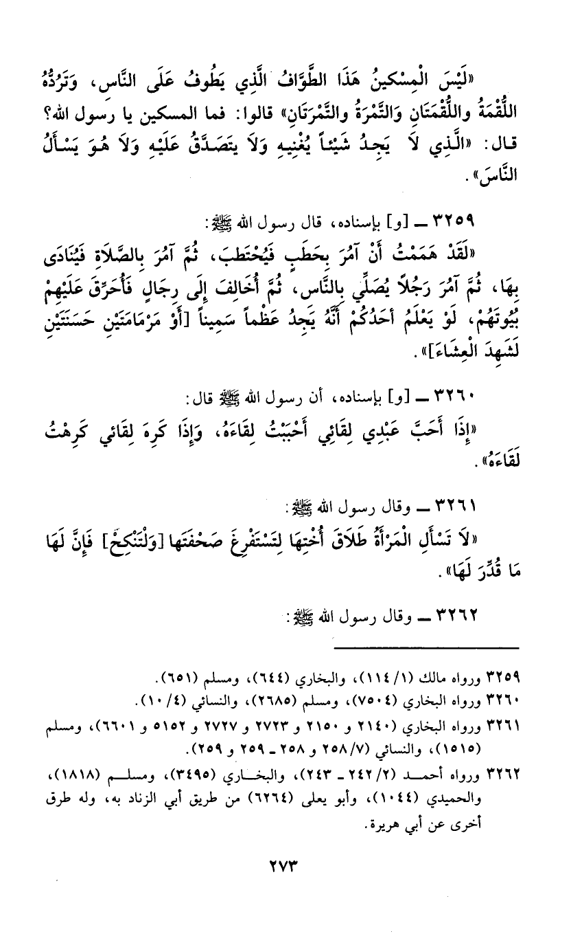 3259 - وَبِإِسْنَادِهِ، قَالَ رَسُولُ اللَّهِ صَلَّى اللهُ عَلَيْهِ وَسَلَّمَ: §«لَقَدْ هَمَمْتُ أَنْ آمُرَ بِحَطَبٍ فَيَحْتَطِبَ، ثُمَّ آمُرُ بِالصَّلَاةِ فَيُنَادَى بِهَا، ثُمَّ آمُرُ رَجُلًا يُصَلِّي بِالنَّاسِ، ثُمَّ أُخَالِفُ إِلَى رِجَالٍ فَأُحَرِّقَ عَلَيْهِمْ بُيُوتَهُمْ، لَوْ يَعْلَمُ أَحَدُكُمْ أَنَّهُ يَجِدُ عَظْمًا سَمِينًا [أَوْ مَرْمَامَتَيْنِ حَسَنَتَيْنِ لَشَهِدَ الْعِشَاءَ] »