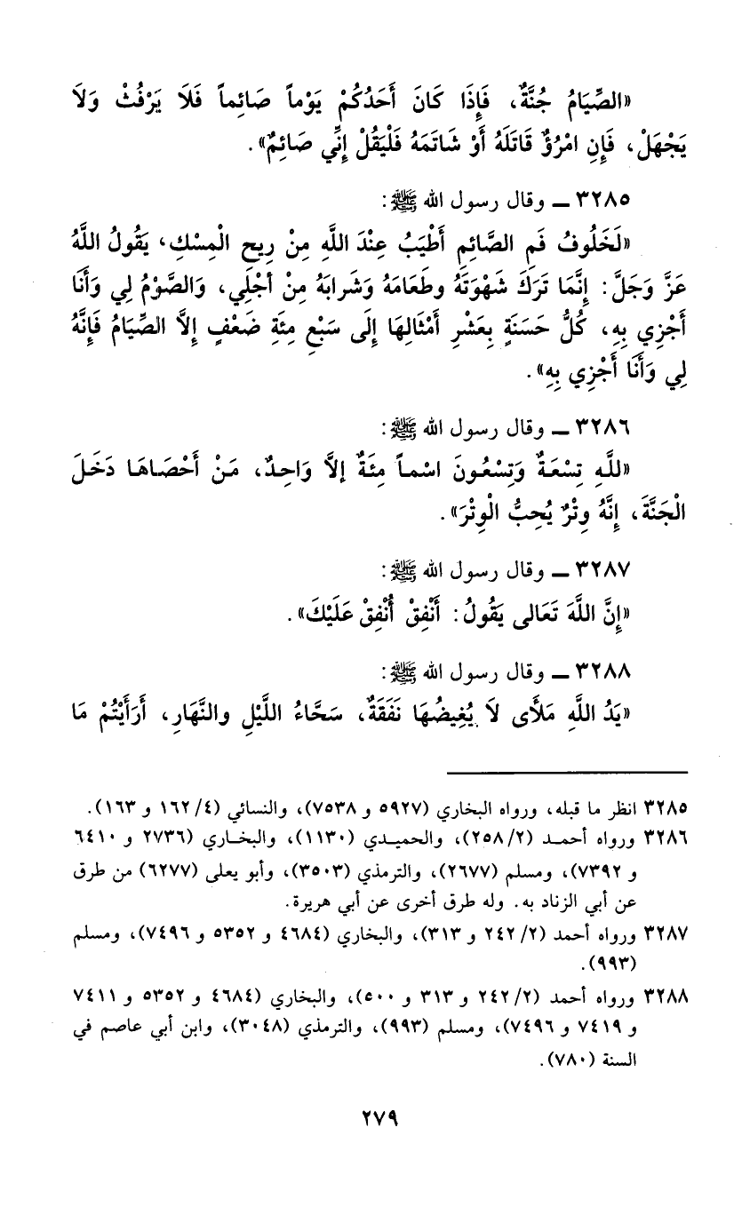 3286 - وَقَالَ رَسُولُ اللَّهِ صَلَّى اللهُ عَلَيْهِ وَسَلَّمَ: «§لِلَّهِ تِسْعَةٌ وَتِسْعُونَ اسْمًا مِئَةٌ إِلَّا وَاحِدٌ، مَنْ أَحْصَاهَا دَخَلَ الْجَنَّةَ، إِنَّهُ وِتْرٌ يُحِبُّ الْوِتْرَ»
