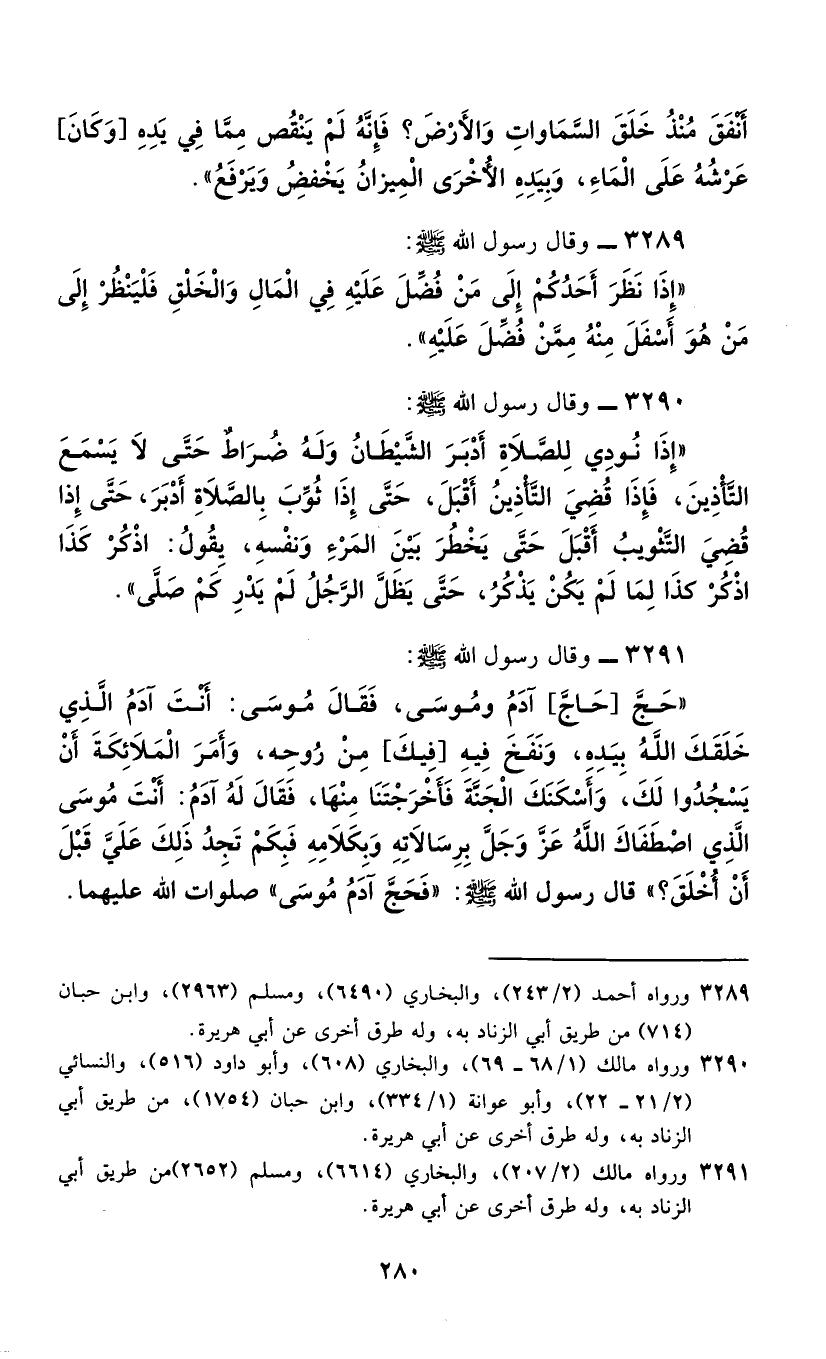 3291 - وَقَالَ رَسُولُ اللَّهِ صَلَّى اللهُ عَلَيْهِ وَسَلَّمَ: " §حَجَّ [حَاجَّ] آدَمُ وَمُوسَى، فَقَالَ مُوسَى: أَنْتَ آدَمُ الَّذِي خَلَقَكَ اللَّهُ بِيَدِهِ، وَنَفَخَ فِيهِ [فِيكَ] مِنْ رُوحِهِ، وَأَمَرَ الْمَلَائِكَةَ أَنْ يَسْجُدُوا لَكَ، وَأَسْكَنَكَ الْجَنَّةَ فَأَخْرَجْتَنَا مِنْهَا، فَقَالَ لَهُ آدَمُ: أَنْتَ مُوسَى الَّذِي اصْطَفَاكَ اللَّهُ عَزَّ وَجَلَّ بِرِسَالَاتِهِ وَبِكَلَامِهِ، فَبِكَمْ تَجِدُ ذَلِكَ عَلَيَّ قَبْلَ أَنْ أُخْلَقَ؟ " قَالَ رَسُولُ اللَّهِ صَلَّى اللهُ عَلَيْهِ وَسَلَّمَ: «فَحَجَّ آدَمُ مُوسَى» صَلَوَاتِ اللَّهِ عَلَيْهِمَا