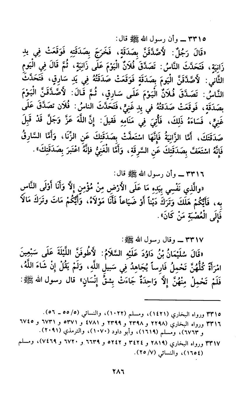 3317 - وَقَالَ رَسُولُ اللَّهِ صَلَّى اللهُ عَلَيْهِ وَسَلَّمَ: " §قَالَ سُلَيْمَانُ بْنُ دَاوُدَ عَلَيْهِ السَّلَامُ: لَأَطُوفَنَّ اللَّيْلَةَ عَلَى سَبْعِينَ امْرَأَةٍ كُلُّهُنَّ تَحْمِلُ فَارِسًا يُجَاهِدُ فِي سَبِيلِ اللَّهِ، وَلَمْ يَقُلْ إِنَّ شَاءَ اللَّهُ، فَلَمْ تَحْمِلْ مِنْهُنَّ إِلَّا وَاحِدَةٌ جَاءَتْ بِشِقِّ إِنْسَانٍ " قَالَ رَسُولُ اللَّهِ صَلَّى اللهُ عَلَيْهِ وَسَلَّمَ -[287]-: «وَالَّذِي نَفْسِي بِيَدِهِ لَوْ قَالَ إِنَّ شَاءَ اللَّهُ لَجَاءَتْ كُلُّ وَاحِدَةٍ بِفَارِسٍ يُجَاهِدُ فِي سَبِيلِ اللَّهِ»