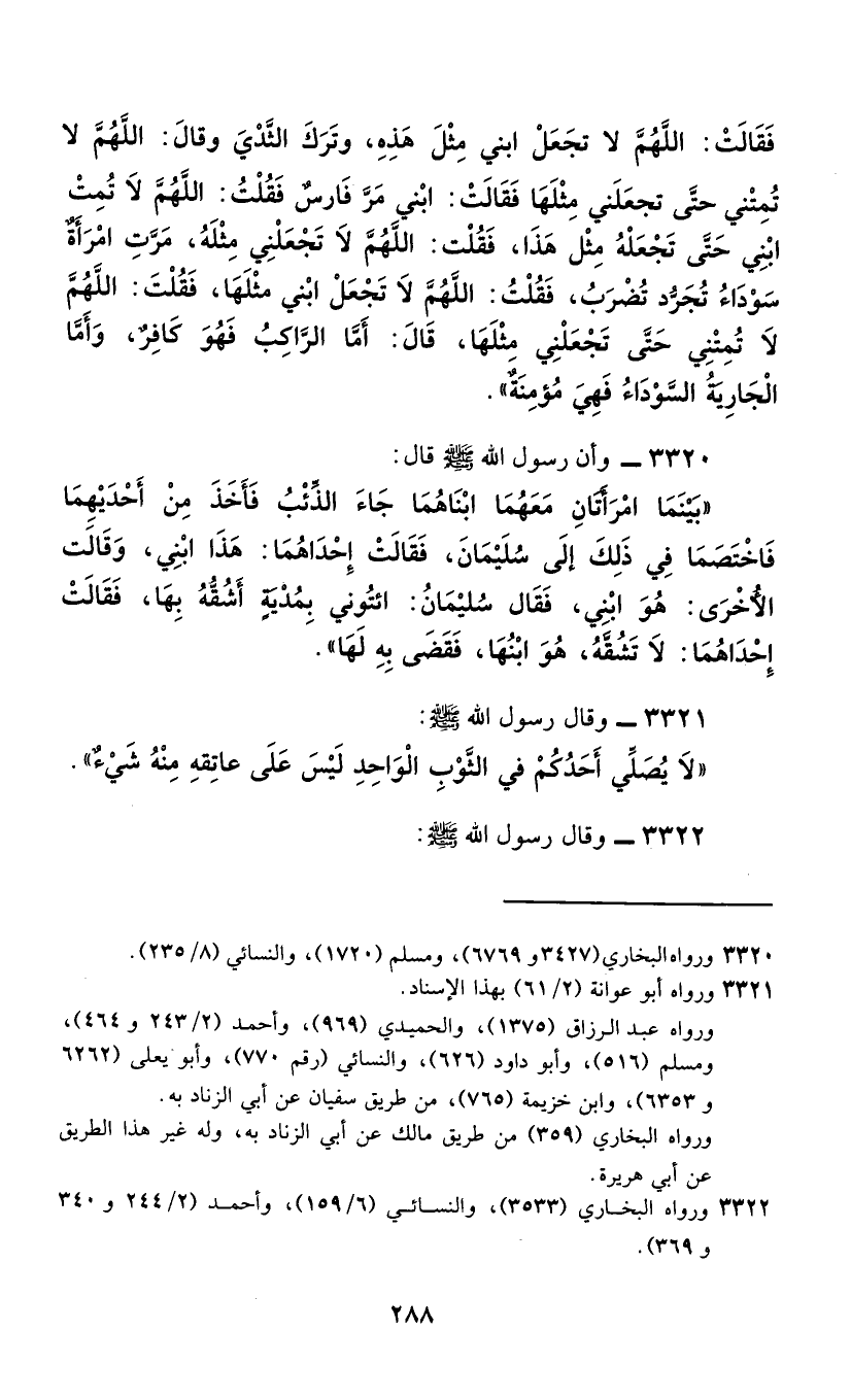 3320 - وَأَنَّ رَسُولَ اللَّهِ صَلَّى اللهُ عَلَيْهِ وَسَلَّمَ قَالَ: §" بَيْنَمَا امْرَأَتَانِ مَعَهُمَا ابْنَاهُمَا جَاءَ الذِّئْبُ فَأَخَذَ مِنْ أَحَدَيْهِمَا فَاخْتَصَمَا فِي ذَلِكَ إِلَى سُلَيْمَانَ، فَقَالَتْ إِحْدَاهُمَا: هَذَا ابْنِي، وَقَالَتِ الْأُخْرَى: هُوَ ابْنِي، فَقَالَ سُلَيْمَانُ: ائْتُونِي بِمُدْيَةٍ أَشُقُّهُ بِهَا، فَقَالَتْ إِحْدَاهُمَا: لَا تُشِقَّهُ، هُوَ ابْنُهَا، فَقَضَى بِهِ لَهَا "