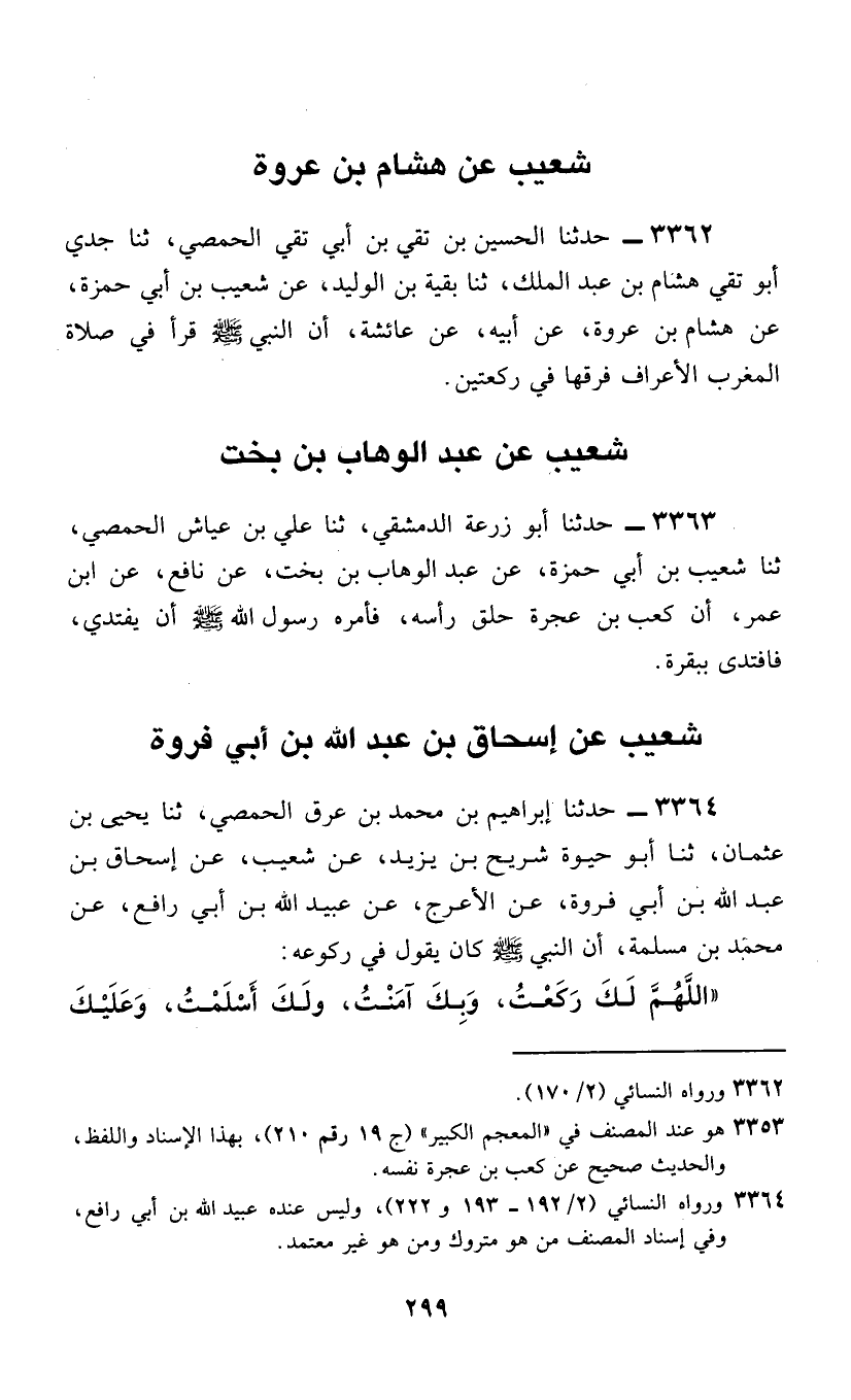 3364 - حَدَّثَنَا إِبْرَاهِيمُ بْنُ مُحَمَّدِ بْنِ عِرْقِ الْحِمْصِيُّ، ثَنَا يَحْيَى بْنُ عُثْمَانَ، ثَنَا أَبُو حَيْوَةَ شُرَيْحُ بْنُ يَزِيدَ، عَنْ شُعَيْبٍ، عَنْ إِسْحَاقَ بْنِ عَبْدِ اللَّهِ بْنِ أَبِي فَرْوَةَ، عَنِ الْأَعْرَجِ، عَنْ عُبَيْدِ اللَّهِ بْنِ أَبِي رَافِعٍ، عَنْ مُحَمَّدِ بْنِ مَسْلَمَةَ، أَنَّ النَّبِيَّ صَلَّى اللهُ عَلَيْهِ وَسَلَّمَ كَانَ §يَقُولُ فِي رُكُوعِهِ: «اللَّهُمَّ لَكَ رَكَعْتُ، وَبِكَ آمَنْتُ، وَلَكَ أَسْلَمْتُ، وَعَلَيْكَ -[300]- تَوَكَّلْتُ، أَنْتَ رَبِّي خَشَعَ سَمْعِي وَبَصَرِي وَدَمِي وَمُخِّي وَعِظَامِي وَعَصَبِي لِلَّهِ رَبِّ الْعَالَمِينَ»