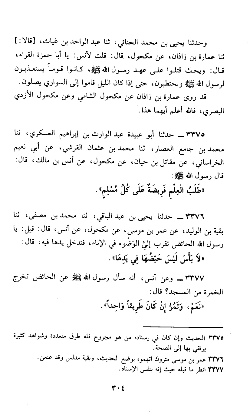 3375 - حَدَّثَنَا أَبُو عُبَيْدَةَ عَبْدُ الْوَارِثِ بْنُ إِبْرَاهِيمَ الْعَسْكَرِيُّ، ثَنَا مُحَمَّدُ بْنُ جَامِعٍ الْعَصَّارُ، ثَنَا مُحَمَّدُ بْنُ عُثْمَانَ الْقُرَشِيُّ، عَنْ أَبِي نُعَيْمٍ الْخُرَاسَانِيِّ، عَنْ مُقَاتِلِ بْنِ حَيَّانَ، عَنْ مَكْحُولٍ، عَنْ أَنَسِ بْنِ مَالِكٍ، قَالَ: قَالَ رَسُولُ اللَّهِ صَلَّى اللهُ عَلَيْهِ وَسَلَّمَ: §«طَلَبُ الْعِلْمِ فَرِيضَةٌ عَلَى كُلِّ مُسْلِمٍ»