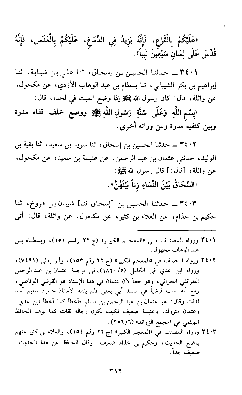 3402 - حَدَّثَنَا الْحُسَيْنُ بْنُ إِسْحَاقَ، ثَنَا سُوَيْدُ بْنُ سَعِيدٍ، ثَنَا بَقِيَّةُ بْنُ الْوَلِيدِ، حَدَّثَنِي عُثْمَانُ بْنُ عَبْدِ الرَّحْمَنِ، عَنْ عَنْبَسَةَ بْنِ سَعِيدٍ، عَنْ مَكْحُولٍ، عَنْ وَاثِلَةَ، قَالَ: قَالَ رَسُولُ اللَّهِ صَلَّى اللهُ عَلَيْهِ وَسَلَّمَ: §«السِّحَاقُ بَيْنَ النِّسَاءِ زِنًا بَيْنَهُنَّ»