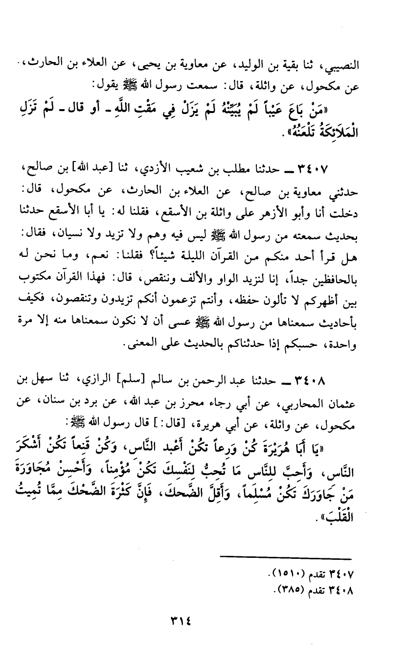 3408 - حَدَّثَنَا عَبْدُ الرَّحْمَنِ بْنُ سَالِمٍ [سَلْمٍ] الرَّازِيُّ، ثَنَا سَهْلُ بْنُ عُثْمَانَ الْمُحَارِبِيُّ، عَنْ أَبِي رَجَاءِ بْنِ عَبْدِ اللَّهِ، عَنْ بُرْدِ بْنِ سِنَانٍ، عَنْ مَكْحُولٍ، عَنْ وَاثِلَةَ، عَنْ أَبِي هُرَيْرَةَ، قَالَ: قَالَ رَسُولُ اللَّهِ صَلَّى اللهُ عَلَيْهِ وَسَلَّمَ: «يَا أَبَا هُرَيْرَةَ، §كُنْ وَرِعًا تَكُنْ أَعْبَدَ النَّاسِ، وَكُنْ قَنِعًا تَكُنْ أَشْكَرَ النَّاسِ، وَأَحِبَّ لِلنَّاسِ مَا تُحِبُّ لِنَفْسِكَ تَكُنْ مُؤْمِنًا، وَأَحْسِنْ مُجَاوَرَةَ مَنْ جَاوَرَكَ تَكُنْ مُسْلِمًا، وَأَقِلَّ الضَّحِكَ، فَإِنَّ كَثْرَةَ الضَّحِكِ مِمَّا تُمِيتُ الْقَلْبَ»