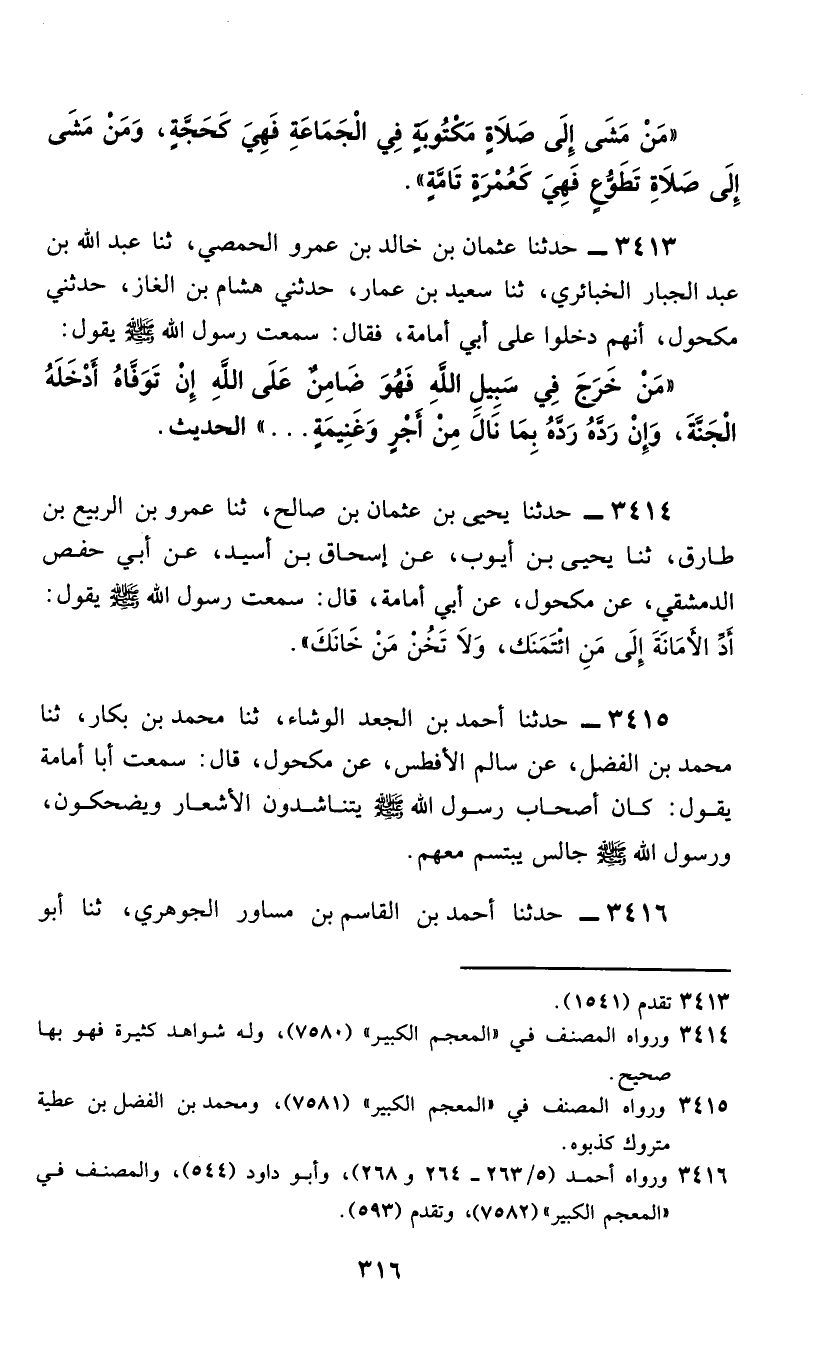 3413 - حَدَّثَنَا عُثْمَانُ بْنُ خَالِدِ بْنِ عَمْرٍو الْحِمْصِيُّ، ثَنَا عَبْدُ اللَّهِ بْنُ عَبْدِ الْجَبَّارِ الْخَبَائِرِيُّ، ثَنَا سَعِيدُ بْنُ عَمَّارٍ، حَدَّثَنِي هِشَامُ بْنُ الْغَازِ، حَدَّثَنِي مَكْحُولٌ أَنَّهُمْ دَخَلُوا عَلَى أَبِي أُمَامَةَ، فَقَالَ: سَمِعْتُ رَسُولَ اللَّهِ صَلَّى اللهُ عَلَيْهِ وَسَلَّمَ يَقُولُ: §«مَنْ خَرَجَ فِي سَبِيلِ اللَّهِ فَهُوَ ضَامِنٌ عَلَى اللَّهِ إِنْ تَوَفَّاهُ أَدْخَلَهُ الْجَنَّةَ، وَإِنْ رَدَّهُ رَدَّهُ بِمَا نَالَ مِنْ أَجْرٍ وَغَنِيمَةٍ. . .» الْحَدِيثُ