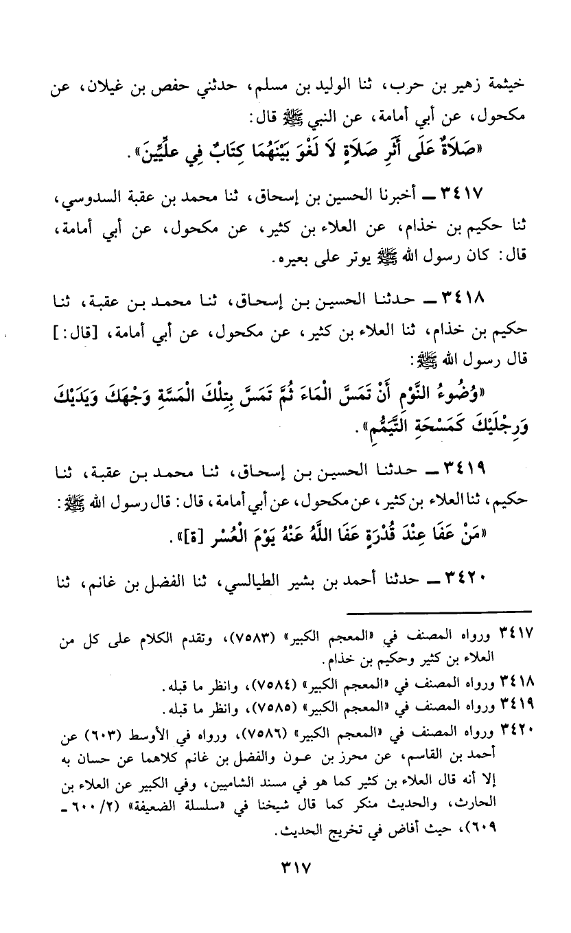 3417 - أَخْبَرَنَا الْحُسَيْنُ بْنُ إِسْحَاقَ، ثَنَا مُحَمَّدُ بْنُ عُقْبَةَ السَّدُوسِيُّ، ثَنَا حَكِيمُ بْنُ خِذَامٍ، عَنِ الْعَلَاءِ بْنِ كَثِيرٍ، عَنْ مَكْحُولٍ، عَنْ أَبِي أُمَامَةَ، قَالَ: «كَانَ رَسُولُ اللَّهِ صَلَّى اللهُ عَلَيْهِ وَسَلَّمَ §يُوتِرُ عَلَى بَعِيرِهِ»