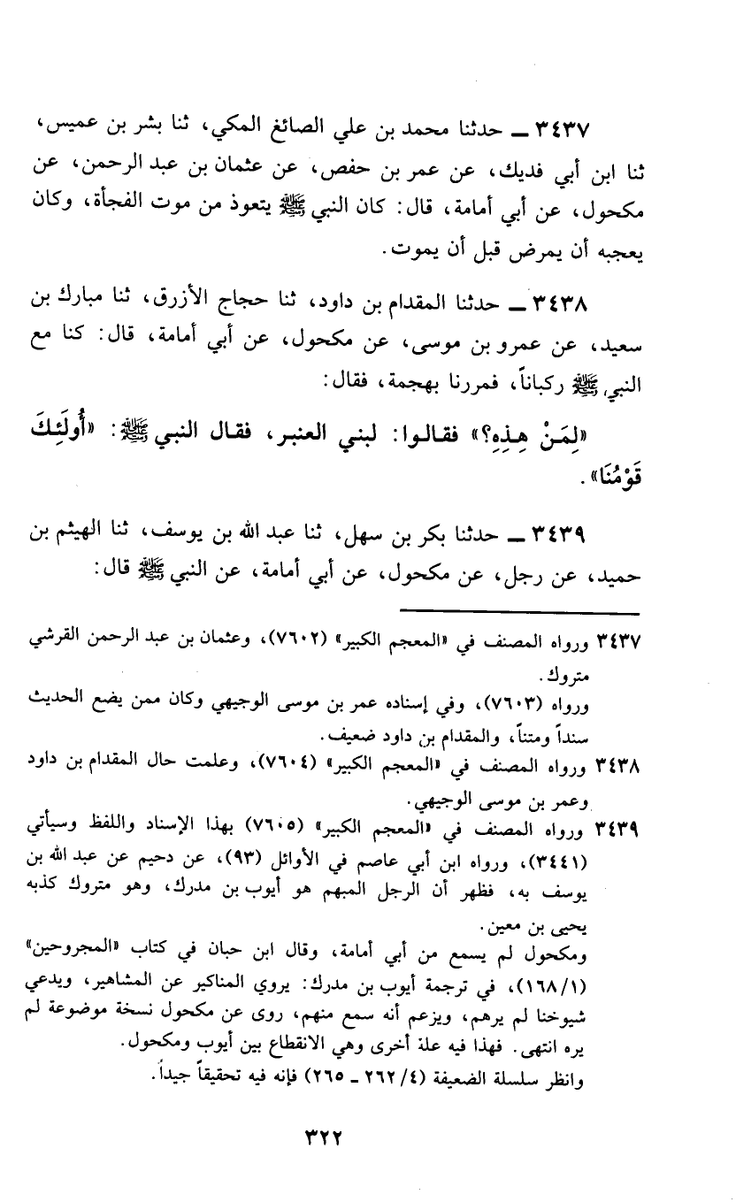 3437 - حَدَّثَنَا مُحَمَّدُ بْنُ عَلِيٍّ الصَّائِغُ الْمَكِّيُّ، ثَنَا بِشْرُ بْنُ عُبَيْسٍ، ثَنَا ابْنُ أَبِي فُدَيْكٍ، عَنْ عُمَرَ بْنِ حَفْصٍ، عَنْ عُثْمَانَ بْنِ عَبْدِ الرَّحْمَنِ، عَنْ مَكْحُولٍ، عَنْ أَبِي أُمَامَةَ، قَالَ: «كَانَ النَّبِيُّ صَلَّى اللهُ عَلَيْهِ وَسَلَّمَ §يَتَعَوَّذُ مِنْ مَوْتِ الْفَجْأَةِ، وَكَانَ يُعْجِبُهُ أَنْ يَمْرَضَ قَبْلَ أَنْ يَمُوتَ»