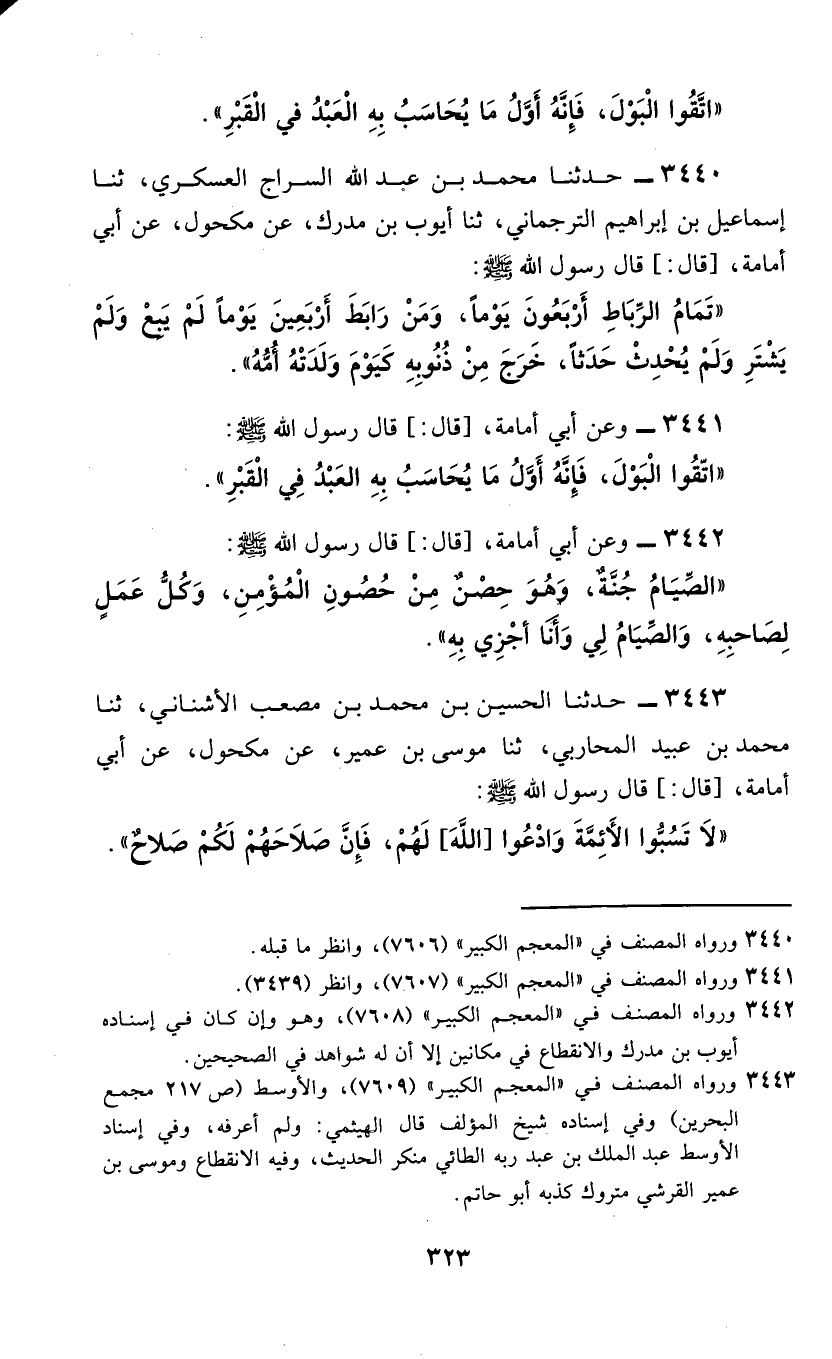 3441 - وَعَنْ أَبِي أُمَامَةَ، قَالَ: قَالَ رَسُولُ اللَّهِ صَلَّى اللهُ عَلَيْهِ وَسَلَّمَ: «§اتَّقُوا الْبَوْلَ، فَإِنَّهُ أَوَّلُ مَا يُحَاسَبُ بِهِ الْعَبْدُ فِي الْقَبْرِ»