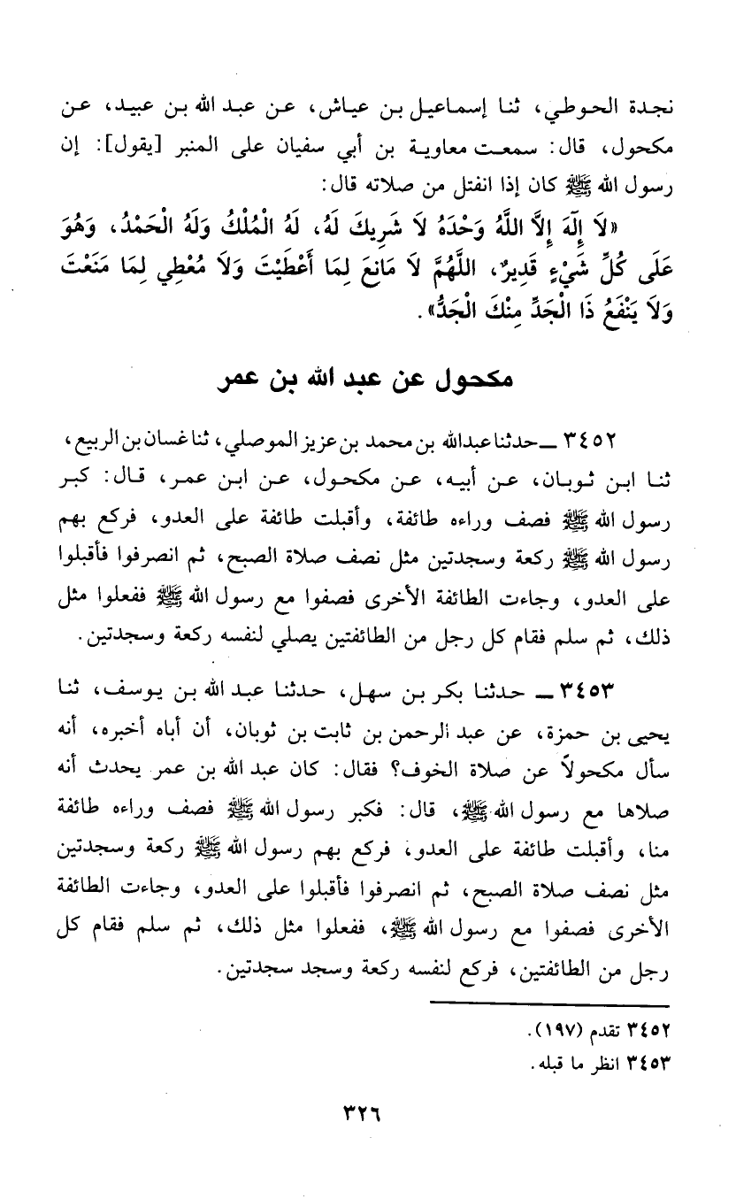 3452 - حَدَّثَنَا عَبْدُ اللَّهِ بْنُ مُحَمَّدِ بْنِ عَزِيزٍ الْمَوْصِلِيُّ، ثَنَا غَسَّانُ بْنُ الرَّبِيعِ، ثَنَا ابْنُ ثَوْبَانَ، عَنْ أَبِيهِ، عَنْ مَكْحُولٍ، عَنِ ابْنِ عُمَرَ، قَالَ: §«كَبَّرَ رَسُولُ اللَّهِ صَلَّى اللهُ عَلَيْهِ وَسَلَّمَ فَصَفَّ وَرَاءَهُ طَائِفَةً، وَأَقْبَلَتْ طَائِفَةٌ عَلَى الْعَدُوِّ، فَرَكَعَ بِهِمْ رَسُولُ اللَّهِ صَلَّى اللهُ عَلَيْهِ وَسَلَّمَ رَكْعَةً وَسَجْدَتَيْنِ مِثْلَ نِصْفِ صَلَاةِ الصُّبْحِ، ثُمَّ انْصَرَفُوا فَأَقْبَلُوا عَلَى الْعَدُوِّ، وَجَاءَتِ الطَّائِفَةُ الْأُخْرَى فَصُفُّوا مَعَ رَسُولِ اللَّهِ صَلَّى اللهُ عَلَيْهِ وَسَلَّمَ فَفَعَلُوا مِثْلَ ذَلِكَ، ثُمَّ سَلَّمَ فَقَامَ كُلُّ رَجُلٍ مِنَ الطَّائِفَتَيْنِ يُصَلِّي لِنَفْسِهِ رَكْعَةً وَسَجْدَتَيْنِ»