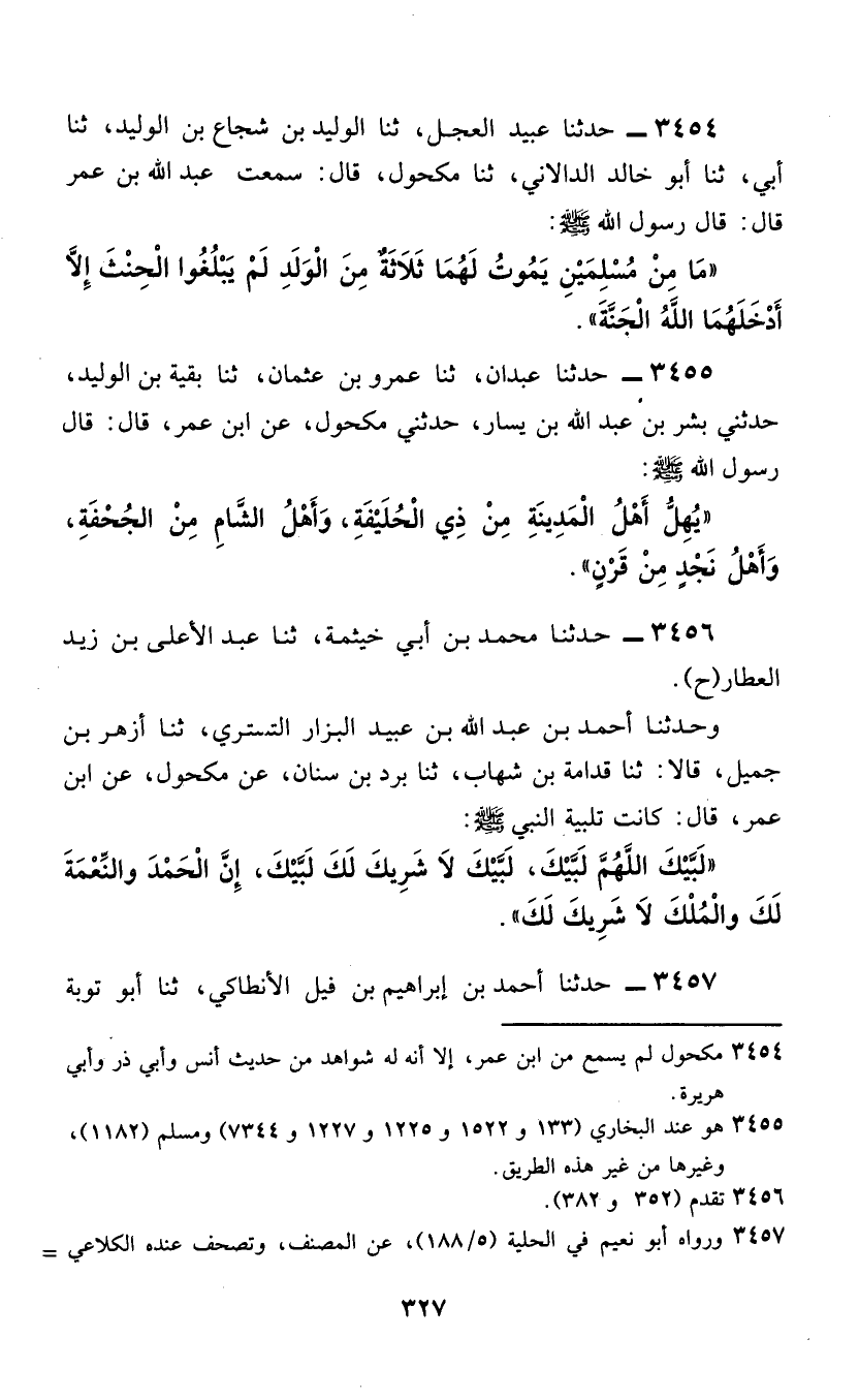 3454 - حَدَّثَنَا عُبَيْدٌ الْعِجْلُ، ثَنَا الْوَلِيدُ بْنُ شُجَاعِ بْنِ الْوَلِيدِ، ثَنَا أَبِي، ثَنَا أَبُو خَالِدٍ الدَّالَانِيُّ، ثَنَا مَكْحُولٌ، قَالَ: سَمِعْتُ عَبْدَ اللَّهِ بْنَ عُمَرَ، قَالَ: قَالَ رَسُولُ اللَّهِ صَلَّى اللهُ عَلَيْهِ وَسَلَّمَ: §«مَا مِنْ مُسْلِمَيْنِ يَمُوتُ لَهُمَا ثَلَاثَةٌ مِنَ الْوَلَدِ لَمْ يَبْلُغُوا الْحِنْثَ إِلَّا أَدْخَلَهُمَا اللَّهُ الْجَنَّةَ»