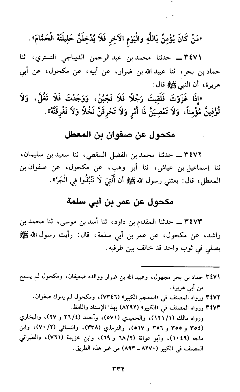 3471 - حَدَّثَنَا مُحَمَّدُ بْنُ عَبْدِ الرَّحِيمِ الدَّيْبَاجِيُّ التُّسْتَرِيُّ، ثَنَا حَمَّادُ بْنُ بَحْرٍ، ثَنَا عُبَيْدُ اللَّهِ بْنُ ضِرَارٍ، عَنْ أَبِيهِ، عَنْ مَكْحُولٍ، عَنْ أَبِي هُرَيْرَةَ، أَنَّ النَّبِيَّ صَلَّى اللهُ عَلَيْهِ وَسَلَّمَ قَالَ: «§إِذَا غَزَوْتَ فَلَقِيتَ رَجُلَا فَلَا تَجْبُنْ، وَوَجَدْتَ فَلَا تَغُلَّ، وَلَا تُؤْذِيَنَّ مُؤْمِنًا، وَلَا تَعْصِيَنَّ ذَا أَمَرٍ وَلَا تَحْرِقَنَّ نَخْلَا وَلَا تُغَرِّقَنَّهُ»