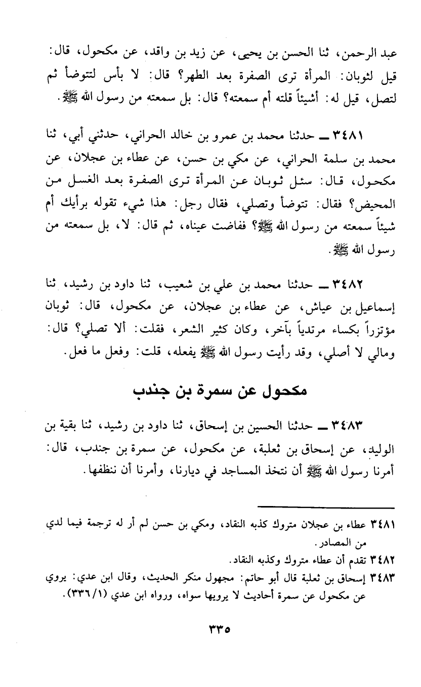 3481 - حَدَّثَنَا مُحَمَّدُ بْنُ عَمْرِو بْنِ خَالِدٍ الْحَرَّانِيُّ، حَدَّثَنِي أَبِي، ثَنَا مُحَمَّدُ بْنُ سَلَمَةَ الْحَرَّانِيُّ، عَنْ مَكِّيِّ بْنِ حَسَنٍ، عَنْ عَطَاءِ بْنِ عَجْلَانَ، عَنْ مَكْحُولٍ، قَالَ: سُئِلَ ثَوْبَانُ عَنِ §الْمَرْأَةِ، تَرَى الصُّفْرَةَ بَعْدَ الْغُسْلِ مِنَ الْمَحِيضِ؟ فَقَالَ: «تَتَوَضَّأُ وَتُصَلِّي» ، فَقَالَ رَجُلٌ: هَذَا شَيْءٌ تَقُولُهُ بِرَأْيِكَ أَمْ شَيْئًا سَمِعْتَهُ مِنْ رَسُولِ اللَّهِ صَلَّى اللهُ عَلَيْهِ وَسَلَّمَ؟ فَفَاضَتْ عَيْنَاهُ، ثُمَّ قَالَ: «لَا، بَلْ سَمِعْتُهُ مِنْ رَسُولِ اللَّهِ صَلَّى اللهُ عَلَيْهِ وَسَلَّمَ»