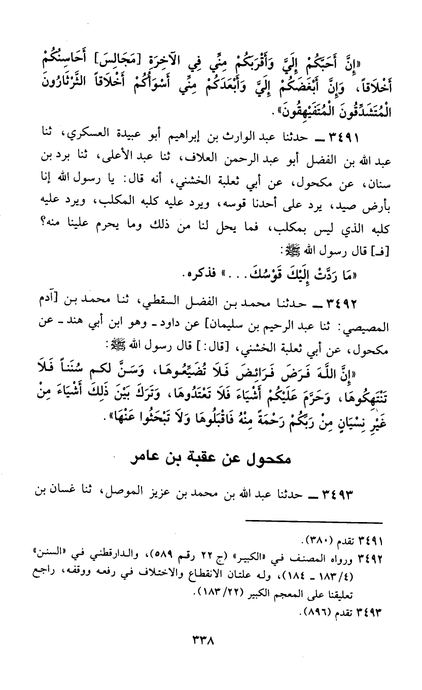 3492 - حَدَّثَنَا مُحَمَّدُ بْنُ الْفَضْلِ السَّقَطِيُّ، ثَنَا مُحَمَّدُ بْنُ [آدَمَ الْمِصِّيصِيُّ: ثَنَا عَبْدُ الرَّحِيمِ بْنُ سُلَيْمَانَ] ، عَنْ دَاوُدَ - وَهُوَ ابْنُ أَبِي هِنْدٍ - عَنْ مَكْحُولٍ، عَنْ أَبِي ثَعْلَبَةَ الْخُشَنِيُّ، قَالَ: قَالَ رَسُولُ اللَّهِ صَلَّى اللهُ عَلَيْهِ وَسَلَّمَ: «§إِنَّ اللَّهَ فَرَضَ فَرَائِضَ فَلَا تُضَيِّعُوهَا، وَسَنَّ لَكُمْ سُنَنًا فَلَا تَنْتَهِكُوهَا، وَحَرَّمَ عَلَيْكُمْ أَشْيَاءَ فَلَا تَعْتَدُوهَا، وَتَرَكَ بَيْنَ ذَلِكَ أَشْيَاءَ مِنْ غَيْرِ نِسْيَانٍ مِنْ رَبِّكُمْ رَحْمَةً مِنْهُ فَاقْبَلُوهَا وَلَا تَبْحَثُوا عَنْهَا»