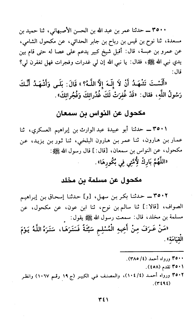 3500 - حَدَّثَنَا عُمَرُ بْنُ عَبْدِ اللَّهِ بْنِ الْحَسَنِ الْأَصْبَهَانِيُّ، ثَنَا حُمَيْدُ بْنُ مَسْعَدَةَ، ثَنَا نُوحُ بْنُ قَيْسِ بْنِ رَبَاحِ بْنِ جَابِرٍ الْحَدَائِيُّ، عَنْ مَكْحُولٍ الشَّامِيُّ، عَنْ عَمْرِو بْنِ عَبَسَةَ، قَالَ: أَقْبَلَ شَيْخٌ كَبِيرٌ يَدْعَمَ عَلَى عَصًا لَهُ حَتَّى قَامَ بَيْنَ يَدَيْ نَبِيِّ اللَّهِ صَلَّى اللهُ عَلَيْهِ وَسَلَّمَ، فَقَالَ: يَا نَبِيَّ اللَّهِ، إِنَّ لِي غَدَرَاتٍ وَفَجَرَاتٍ فَهَلْ تُغْفَرَنْ لِي؟ قَالَ: §«أَلَسْتَ تَشَهَّدُ أَنْ لَا إِلَهَ إِلَّا اللَّهُ؟» قَالَ: بَلَى، وَأَشْهَدُ أَنَّكَ رَسُولُ اللَّهِ، فَقَالَ: «قَدْ غُفِرَتْ لَكَ غَدَرَاتُكَ وَفَجَرَاتُكَ»