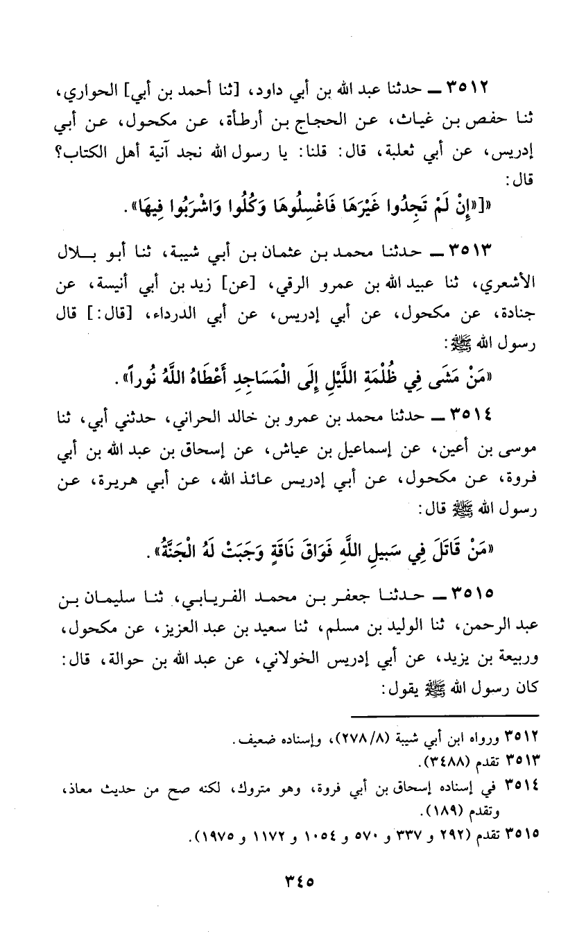3513 - حَدَّثَنَا مُحَمَّدُ بْنُ عُثْمَانَ بْنِ أَبِي شَيْبَةَ، ثَنَا أَبُو بِلَالٍ الْأَشْعَرِيُّ، ثَنَا عُبَيْدُ اللَّهِ بْنُ عَمْرٍو الرَّقِّيُّ، [عَنْ] زَيْدِ بْنِ أَبِي أُنَيْسَةَ، عَنْ جُنَادَةَ، عَنْ مَكْحُولٍ، عَنْ أَبِي إِدْرِيسَ، عَنْ أَبِي الدَّرْدَاءِ، قَالَ: قَالَ رَسُولُ اللَّهِ صَلَّى اللهُ عَلَيْهِ وَسَلَّمَ: §«مَنْ مَشَى فِي ظُلْمَةِ اللَّيْلِ إِلَى الْمَسَاجِدِ أَعْطَاهُ اللَّهُ نُورًا»