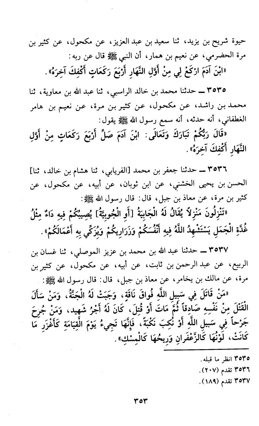 3535 - حَدَّثَنَا مُحَمَّدُ بْنُ خَالِدٍ الرَّاسِبِيُّ، ثَنَا عَبْدُ اللَّهِ بْنُ مُعَاوِيَةَ، ثَنَا مُحَمَّدُ بْنُ رَاشِدٍ، عَنْ مَكْحُولٍ، عَنْ كَثِيرِ بْنِ مُرَّةَ، عَنْ نُعَيْمِ بْنِ هَمَّارِ الْغَطَفَانِيُّ، أَنَّهُ حَدَّثَهُ، أَنَّهُ، سَمِعَ رَسُولَ اللَّهِ صَلَّى اللهُ عَلَيْهِ وَسَلَّمَ يَقُولُ: قَالَ رَبُّكُمْ تَبَارَكَ وَتَعَالَى: «ابْنَ آدَمَ §صَلِّ أَرْبَعَ رَكَعَاتٍ مِنْ أَوِّلِ النَّهَارِ أَكْفِكَ آخِرَهُ»