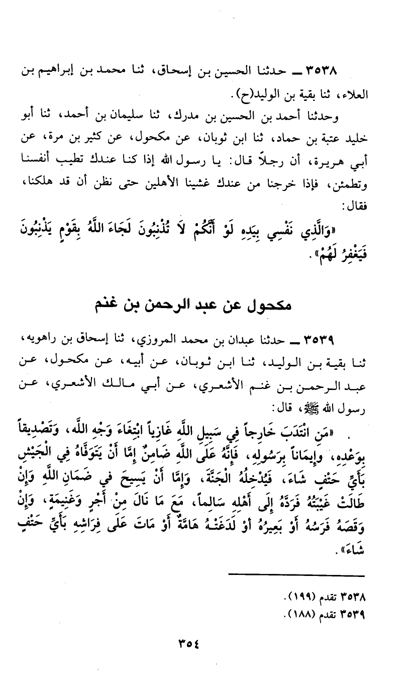 3539 - حَدَّثَنَا عَبْدَانُ بْنُ مُحَمَّدٍ الْمَرْوَزِيُّ، ثَنَا إِسْحَاقُ بْنُ رَاهَوَيْهِ، ثَنَا بَقِيَّةُ بْنُ الْوَلِيدِ، ثَنَا ابْنُ ثَوْبَانَ، عَنْ أَبِيهِ، عَنْ مَكْحُولٍ، عَنْ عَبْدِ الرَّحْمَنِ بْنِ غَنْمٍ الْأَشْعَرِيِّ، عَنْ أَبِي مَالِكٍ الْأَشْعَرِيِّ، عَنْ رَسُولِ اللَّهِ صَلَّى اللهُ عَلَيْهِ وَسَلَّمَ قَالَ: §«مَنِ انْتَدَبَ خَارِجًا فِي سَبِيلِ اللَّهِ غَازِيَا ابْتِغَاءَ وَجْهِ اللَّهِ، وَتَصْدِيقًا بِوَعْدِهِ، وَإِيمَانًا بِرَسُولِهِ، فَإِنَّهُ عَلَى اللَّهِ ضَامِنٌ إِمَّا أَنْ يَتَوَفَّاهُ فِي الْجَيْشِ بِأَيِّ حَتْفٍ شَاءَ، فَيُدْخِلَهُ الْجَنَّةَ، وَإِمَّا أَنْ يَسِيحَ فِي ضَمَانِ اللَّهِ وَإِنَّ طَالَتْ غَيْبَتُهُ فَرَدَّهُ إِلَى أَهْلِهِ سَالِمًا، مَعَ مَا نَالَ مِنْ أَجْرٍ وَغَنِيمَةٍ، وَإِنْ وَقَصَهُ فَرَسُهُ أَوْ بَعِيرُهُ أَوْ لَدَغَتْهُ هَامَّةٌ أَوْ مَاتَ عَلَى فِرَاشِهِ بِأَيِّ حَتْفٍ شَاءَ»