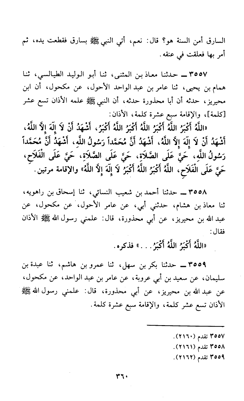 3557 - حَدَّثَنَا مُعَاذُ بْنُ الْمُثَنَّى، ثَنَا أَبُو الْوَلِيدِ الطَّيَالِسِيُّ، ثَنَا هَمَّامُ بْنُ يَحْيَى، ثَنَا عَامِرُ بْنُ عَبْدِ الْوَاحِدِ الْأَحْوَلُ، عَنْ مَكْحُولٍ، أَنَّ ابْنَ مُحَيْرِيزٍ حَدَّثَهُ، أَنَّ أَبَا مَحْذُورَةَ حَدَّثَهُ، أَنَّ النَّبِيَّ صَلَّى اللهُ عَلَيْهِ وَسَلَّمَ عَلَّمَهُ الْأَذَانَ تِسْعَ عَشْرَةَ كَلِمَةً، وَالْإِقَامَةَ سَبْعَ عَشْرَةَ كَلِمَةً، الْأَذَانُ: «§اللَّهُ أَكْبَرُ، اللَّهُ أَكْبَرُ، اللَّهُ أَكْبَرُ، اللَّهُ أَكْبَرُ، أَشْهَدُ أَنْ لَا إِلَهَ إِلَّا اللَّهُ، أَشْهَدُ أَنْ لَا إِلَهَ إِلَّا اللَّهُ، أَشْهَدُ أَنَّ مُحَمَّدًا رَسُولُ اللَّهِ، أَشْهَدُ أَنَّ مُحَمَّدًا رَسُولُ اللَّهِ، حَيَّ عَلَى الصَّلَاةِ، حَيَّ عَلَى الصَّلَاةِ، حَيَّ عَلَى الْفَلَاحِ، حَيَّ عَلَى الْفَلَاحِ، اللَّهُ أَكْبَرُ اللَّهُ أَكْبَرُ لَا إِلَهَ إِلَّا اللَّهُ» وَالْإِقَامَةُ مَرَّتَيْنِ