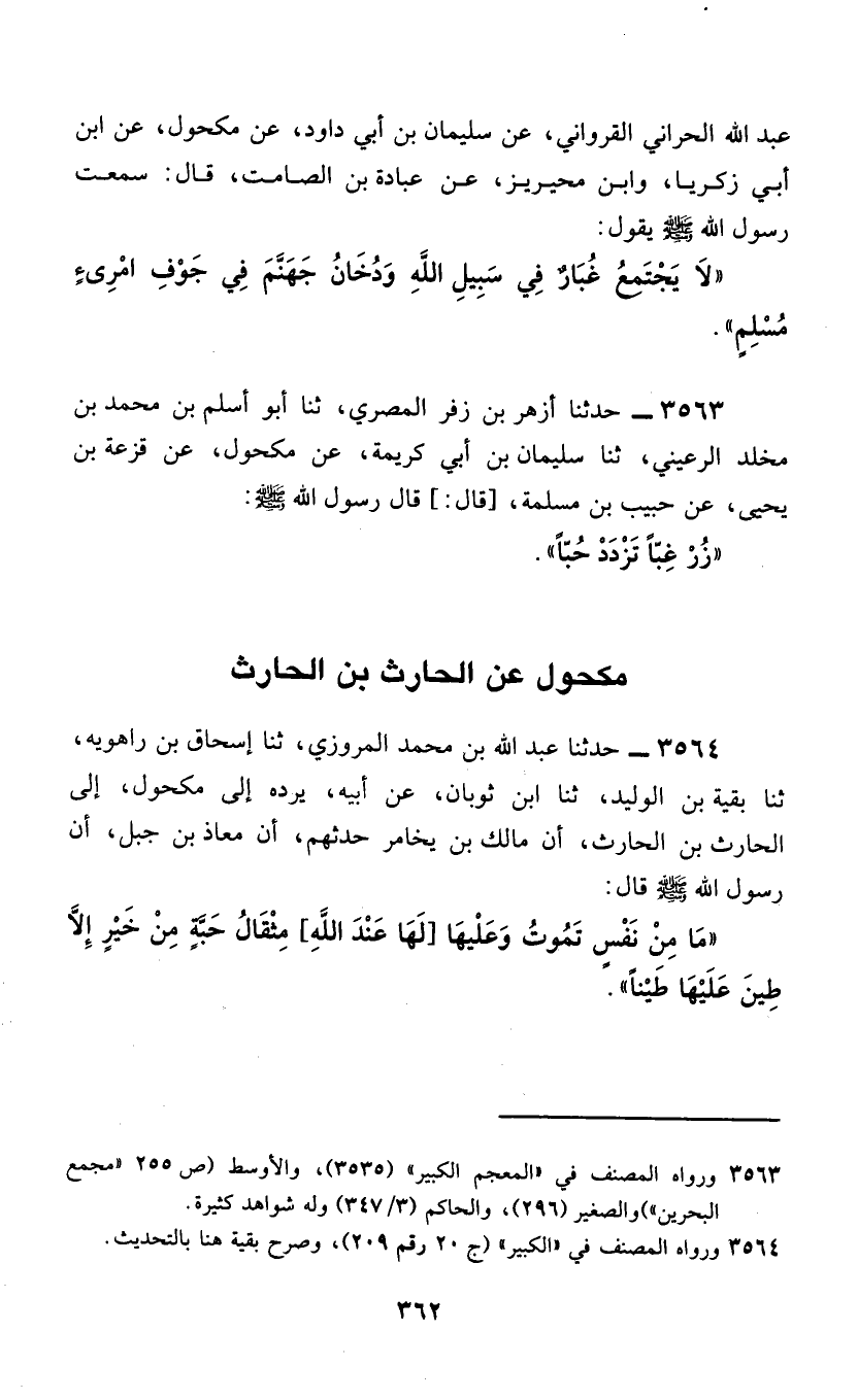 3564 - حَدَّثَنَا عَبْدُ اللَّهِ بْنُ مُحَمَّدٍ الْمَرْوَزِيُّ، ثَنَا إِسْحَاقُ بْنُ رَاهَوَيْهِ، ثَنَا بَقِيَّةُ بْنُ الْوَلِيدِ، ثَنَا ابْنُ ثَوْبَانَ، عَنْ أَبِيهِ، يَرُدُّهُ إِلَى مَكْحُولٍ، إِلَى الْحَارِثِ بْنِ الْحَارِثِ، أَنَّ مَالِكَ بْنَ يُخَامِرَ، حَدَّثَهُمْ، أَنَّ مُعَاذَ بْنَ جَبَلٍ، أَنَّ رَسُولَ اللَّهِ صَلَّى اللهُ عَلَيْهِ وَسَلَّمَ قَالَ: §«مَا مِنْ نَفْسٍ تَمُوتُ لَهَا عِنْدَ اللَّهِ مِثْقَالُ حَبَّةٍ مِنْ خَيْرٍ إِلَّا طِينَ عَلَيْهَا طَيْنًا»